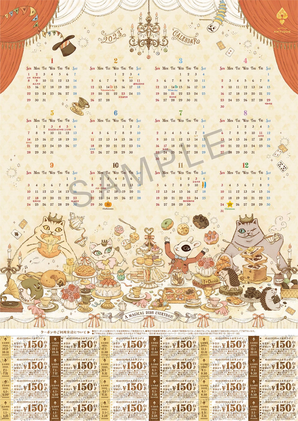 お得なクーポン付きカレンダーは、マジカルアンティークワールドのキャラクターが食卓でアンティークのパンを囲む様子が描かれています。アンティークのファンにはたまらない、ここだけでしか手に入らない特別なデザインの1枚となっております。
