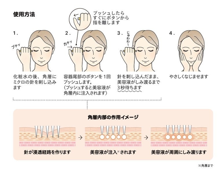 『CONC LABO』RICH SHOTシリーズに採用する注入※2型マイクロニードルは、医療用マイクロニードルから着想し、ノック注入※2で痛みを感じにくい構造にしています。尾部をノックすると先端のニードルから美容液が出てきます。長さ200μm(マイクロメートル)、太さ100μmの極細針ですが、注射針のように中空になっており、美容液を角層内の奥に注入することができます。