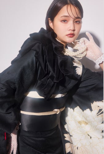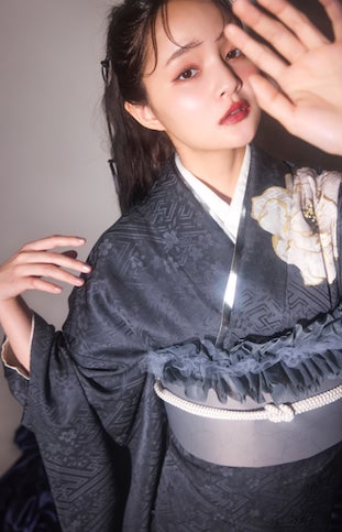 お洋服だけでなく、振袖にも小物で取り入れたスタイリングでトレンドをおさえたビジュアルに。