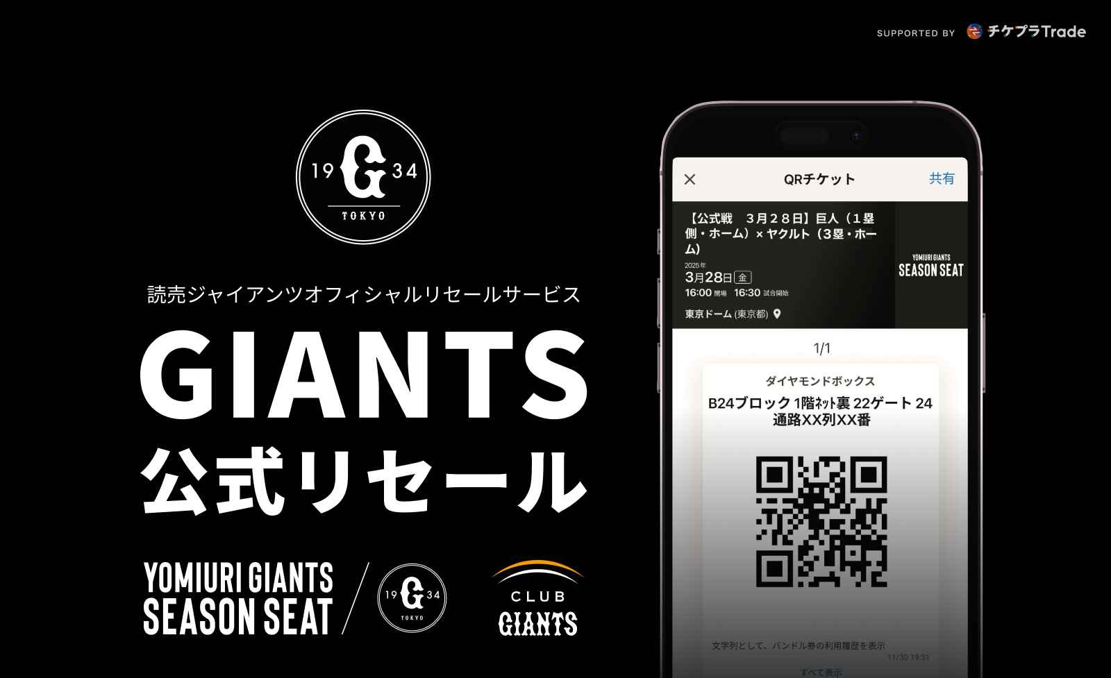 電子チケット事業や高額不正転売対策を講じたチケット二次販売「チケプラTrade」、視聴PASS販売プラットフォーム「StreamPass」を運営する株式会社Tixplus(本社:東京都渋谷区、代表取締役:池田 宗多朗)は、2025年3月10日(月)より「チケプラトレード」の特設トレードにて読売ジャイアンツのチケットリセールサービス「GIANTS公式リセール」を提供することをお知らせします。昨年に引き続きの提供ながら、スポーツ向けの公式リセールとしてアップデートいたしました。