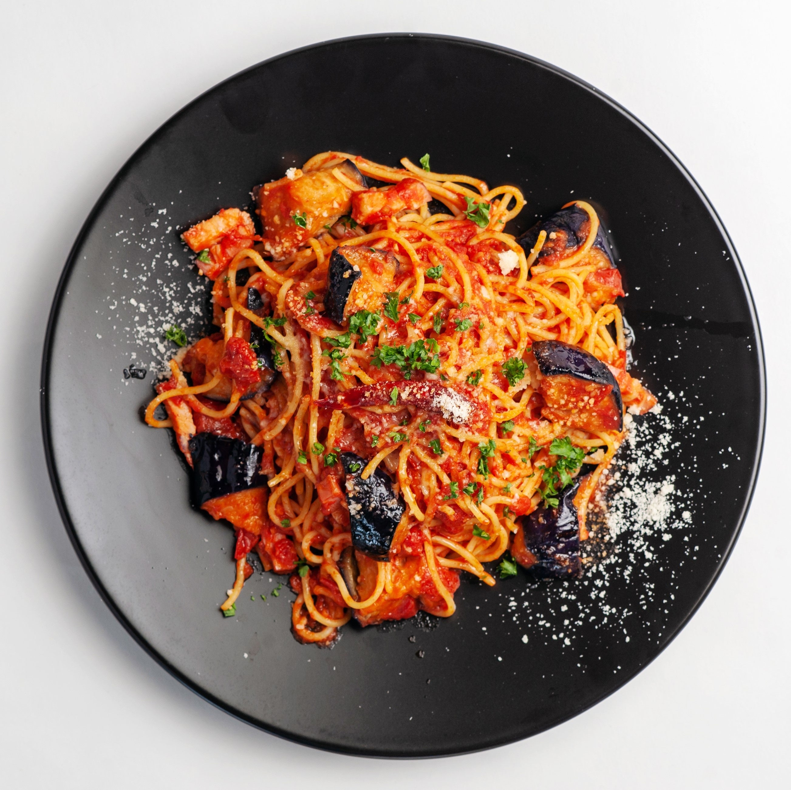 肉厚な茄子とベーコンのトマトソースパスタ。たっぷりのチーズをかけて・生ハムと卵黄をのせた濃厚カルボナーラ 1,500円