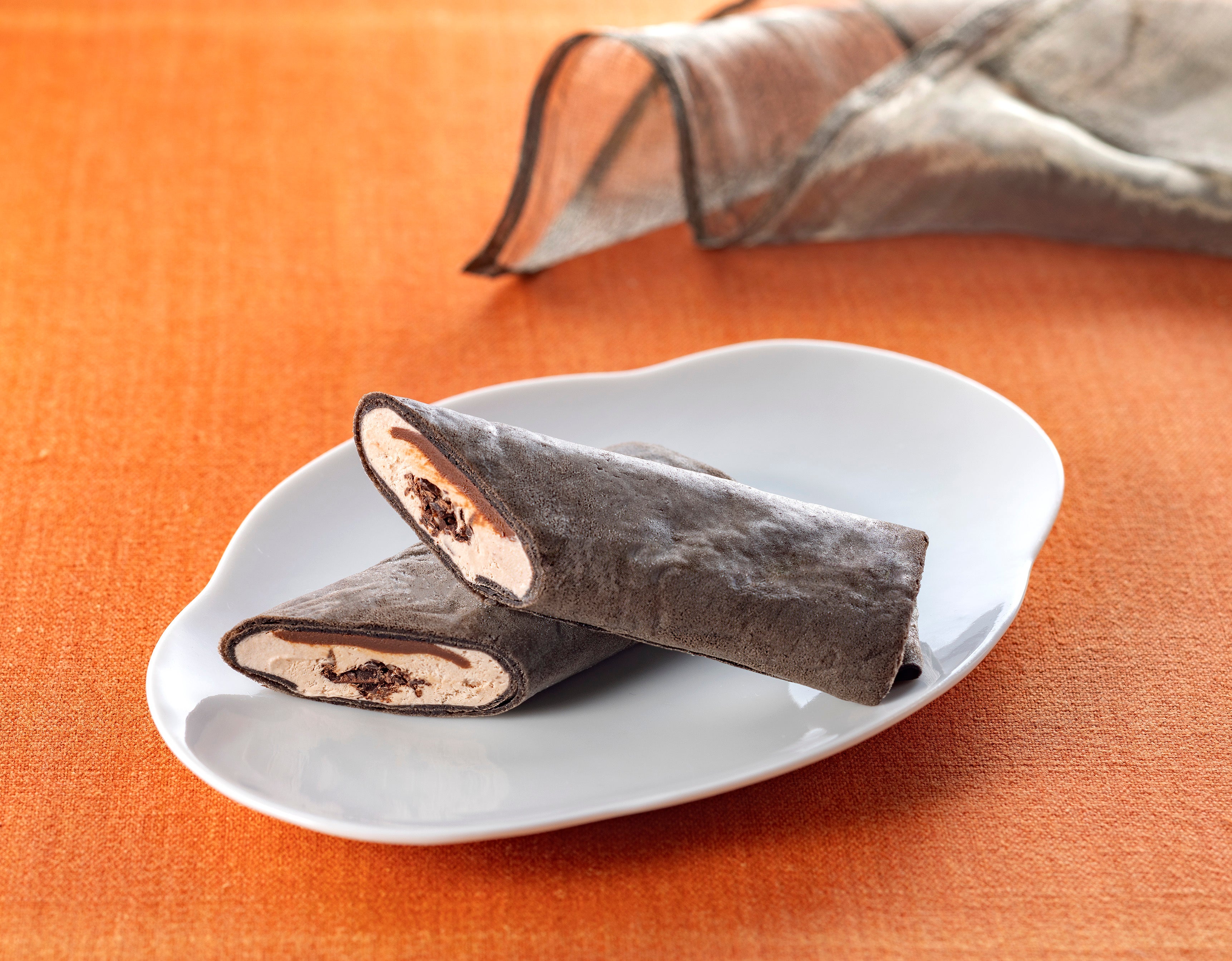生チョコ入りの冷凍ショコラクレープです。チョコホイップ、生チョコ、削りチョコをクレープ生地で包みました。濃厚なチョコの味わいと重層的な食感が魅力です。