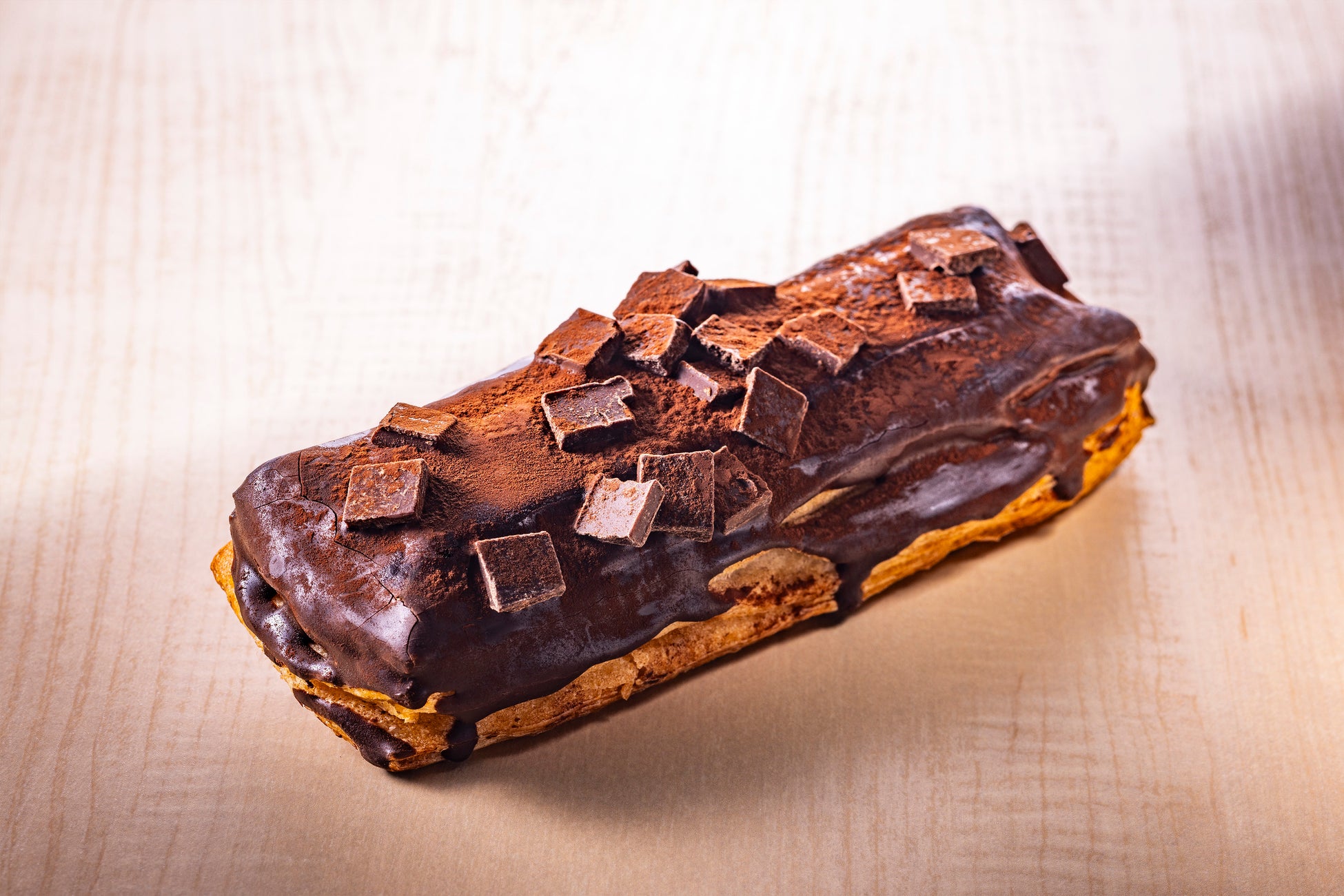チョコレートを折り込んだもちっとした食感の生地に、チョココーチングとチョコチップをのせた菓子パンです。