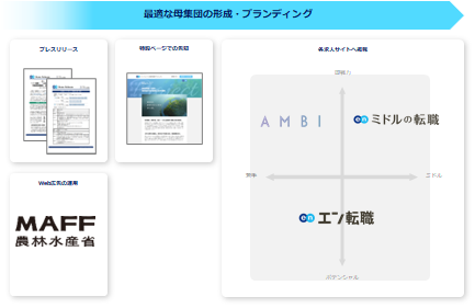 プレスリリースや特設ページ、Web広告での告知に加え、各求人サイトでの集客支援を行ないます。『エン転職』『AMBI』『ミドルの転職』とターゲットの異なる3つの求人サイトを活用することで、ターゲットへ網羅的に求人を届けます。