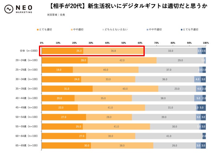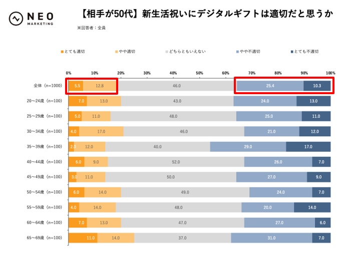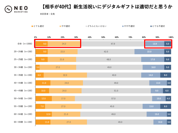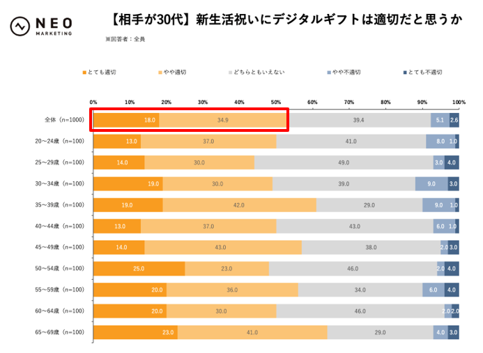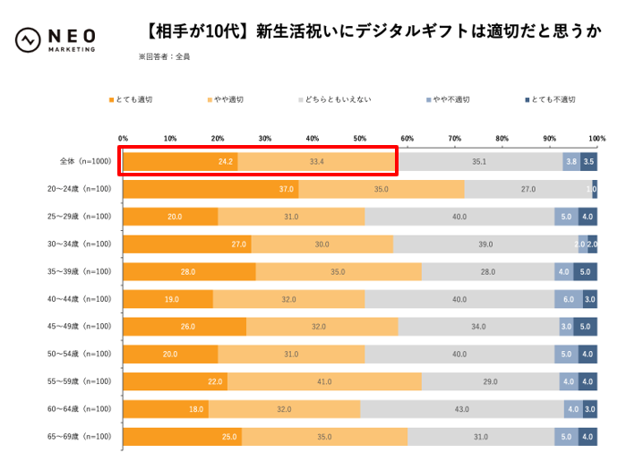 新生活祝いを贈る場合、デジタルギフトは適切だと思うかを、贈る相手の年代別でお聞きしました。