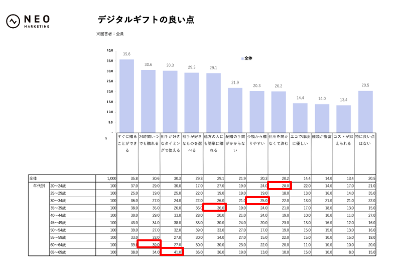 例えば20~24歳では「住所を聞かなくて済む」28.0%、30~34歳では「少額から贈りやすい」25.0%、35~39歳では「遠方の人にも簡単に贈れる」36.0%と高めでした。