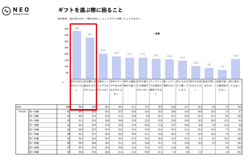 年代によって強弱はあるものの、どの年代も「相手の好みが分からない」「何を贈れば喜ばれるか分からない」が上位にきていた。新生活祝いは、家族や親友のように好みを把握しきっている相手だけでなく、そこまで細かい嗜好まではわからない相手にも贈る機会が多いことがうかがえる。