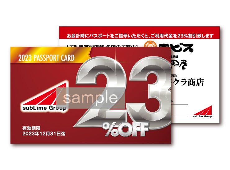 2023年の一年間、対象店舗にてお会計時にご提示いただくとご飲食代金を23%割引いたします。使用回数制限なしのとてもお得なカードです。
