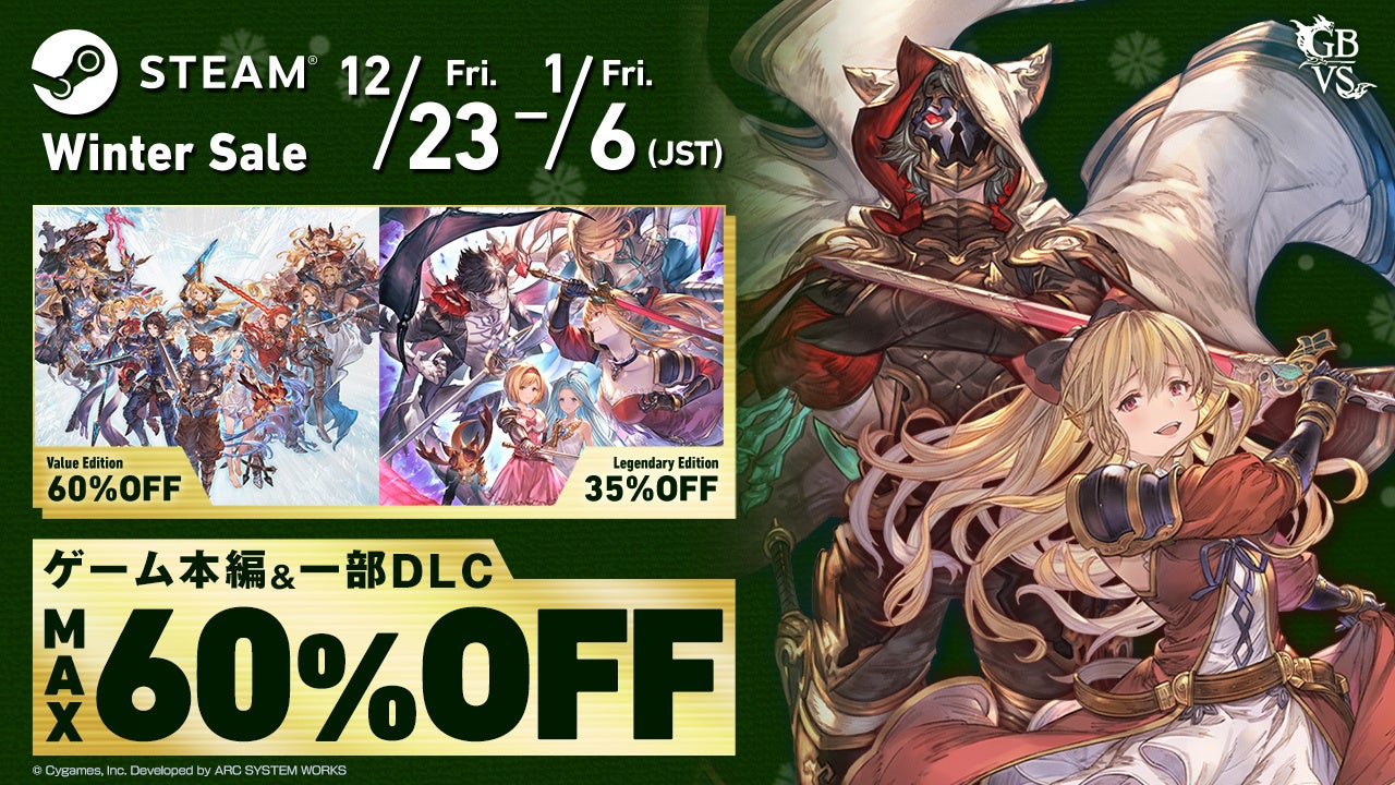 価格 :『グランブルーファンタジー ヴァーサス レジェンダリーエディション』<パッケージ版/ダウンロード版/Steam®版>希望小売価格:6,578円(税込)、『グランブルーファンタジー ヴァーサス Cygames Greatest Hits』<パッケージ版/ダウンロード版>希望小売価格:2,178円(税込)『グランブルーファンタジー ヴァーサス』<Steam®版>希望小売価格:2,178円(税込)