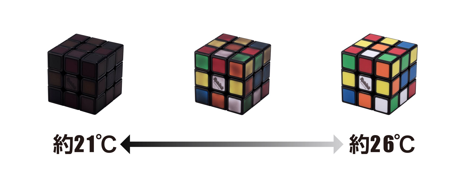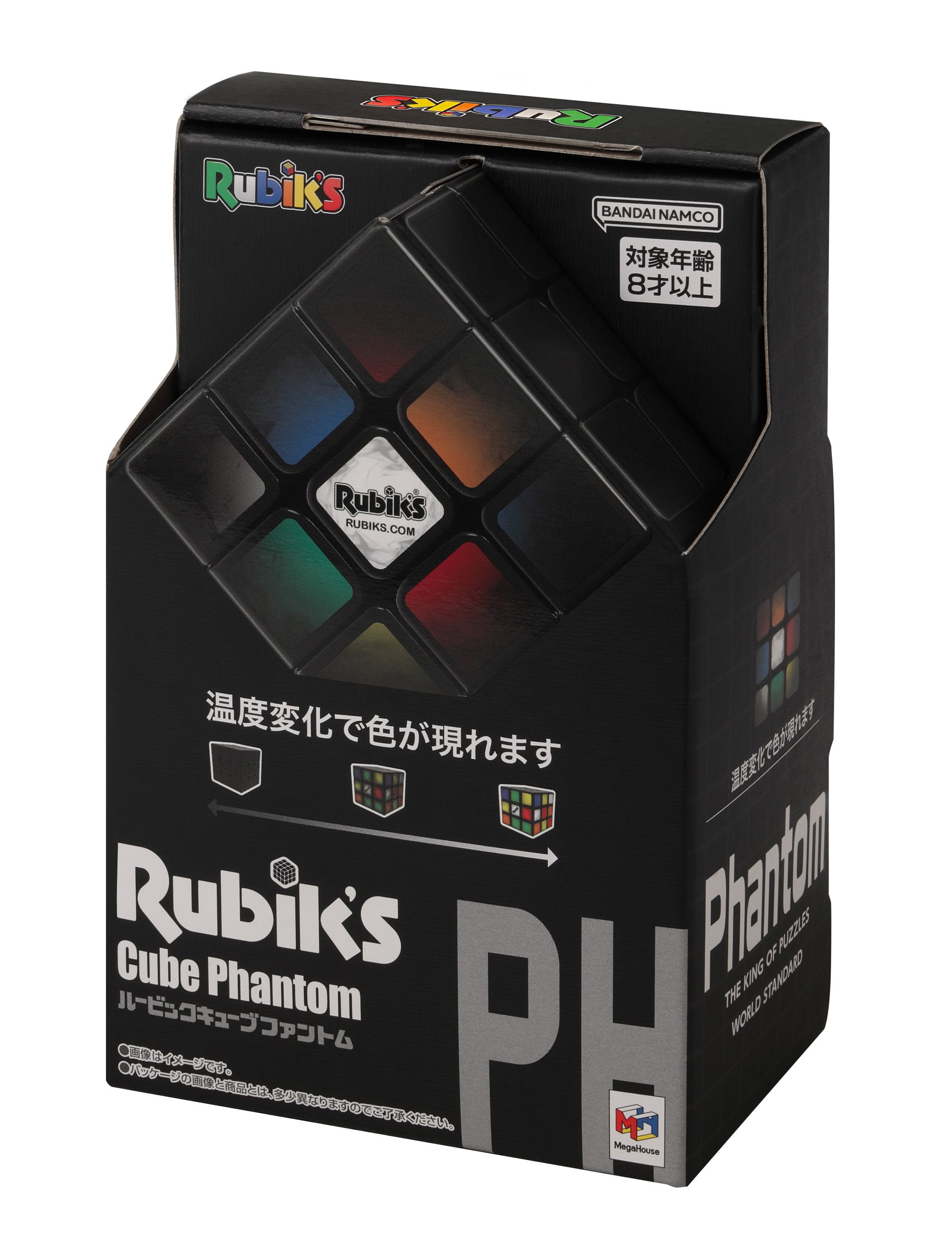 「ルービックキューブファントム」は、温度変化に応じてルービックキューブの表面の色が変化する新感覚のルービックキューブです。表面のパネルは、気温やルービックキューブ表面に接触した時の温度が、約21度以下の時は真っ黒な状態ですが、約26度以上になると通常のルービックキューブ同様に6色カラーがはっきりと出現してきます。全面真っ黒の状態からルービックキューブを揃えていくと、触れた所だけ体温の温かさで色が現れてきます。一か所に長く触れずに素早く回転させていくと、各色が現れづらく視覚が惑わされて難易度があがります。また、色が変わる途中に現れる独特のグラデーションも趣きがあり、これまでにない不思議なルービックキューブです。