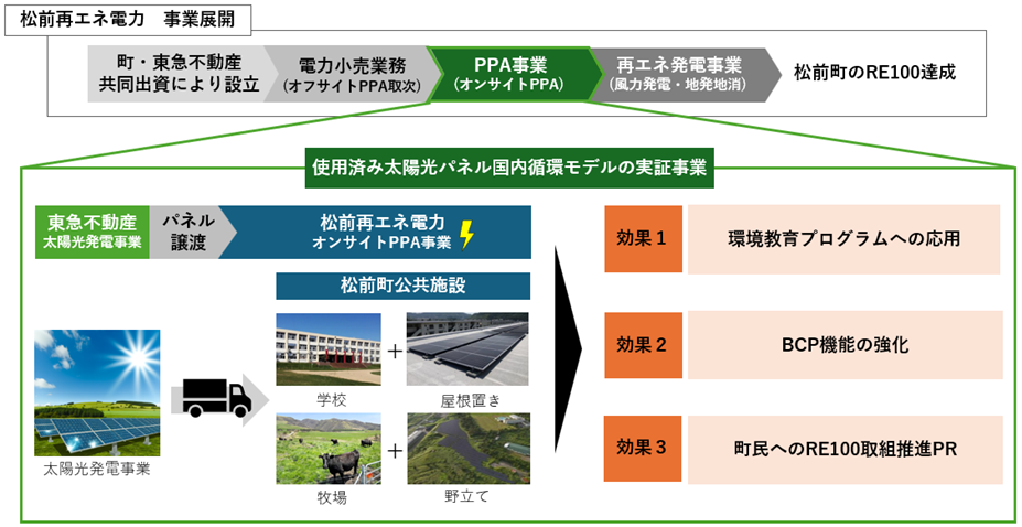 北海道松前町(所在:北海道松前郡松前町、町長:若佐 智弘、以下「松前町」)、松前再エネ電力株式会社(本社:北海道松前郡松前町、代表取締役:佐藤 隆信、以下「Mre-ep」)、および東急不動産株式会社(本社:東京都渋谷区、代表取締役社長:星野 浩明、以下「東急不動産」)は、松前町の町有施設における太陽光パネルリユースによる国内循環モデルの実証(以下「本実証」)を開始いたします。