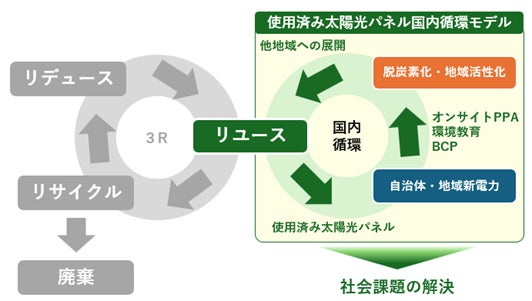 今回の取り組みでは、3Rのうち、「リユース」を促進します。太陽光パネルの耐用年数は、メーカーの性能保証においても25年程度と長期に渡り使用が可能であることから、太陽光パネル廃棄における環境負荷の低減には、リサイクルの前に使えるものはリユースしていく必要があります。その為、本実証では、太陽光パネルのリユースによって太陽光パネルの利用期間の最大化をはかりつつ、資源の国内循環モデルの確立を目指します。