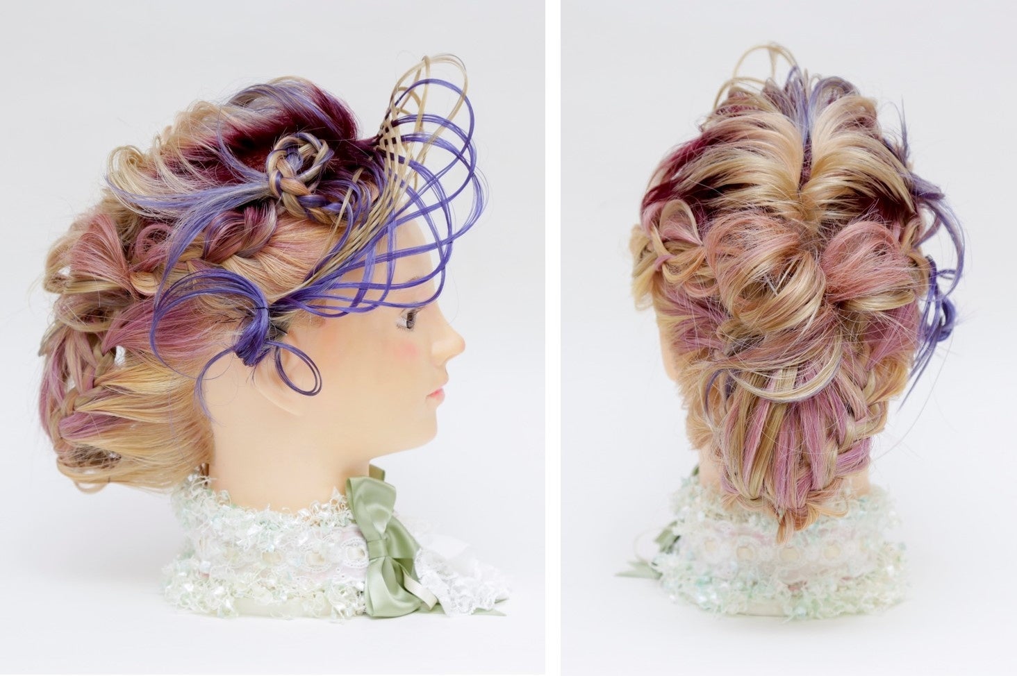 「弧(Arc)」は弓のように曲がる意を表し、丸く柔和でしなやか、張りがある、自分がそうありたいと“弧”を選びました。特に工夫したのは、アップスタイルにすると浮きやすく、ウィッグとの境目が目立ちやすいストッパー部分に、編み込みを取り入れることで固定力を上げ、デザインも引き立たせたことです。フロントの網の部分はしなやかに波打つようにしました。