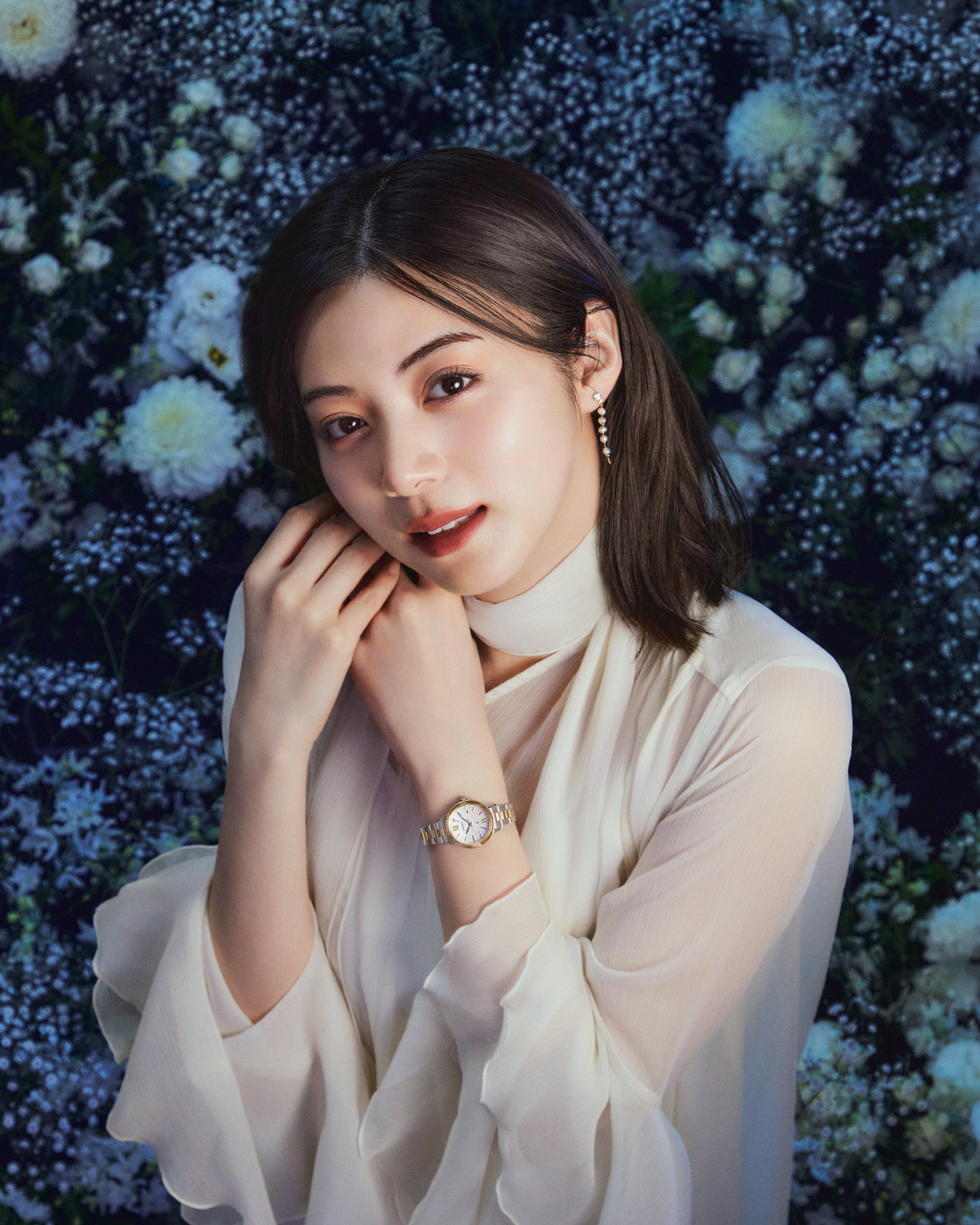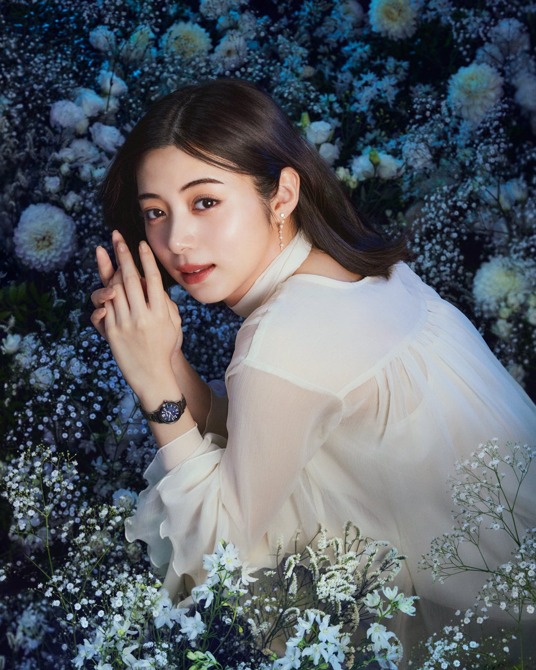 当日、透け感のある柔らかな印象のワンピースで登場した池田さん。「星々や月」をイメージした、洗練されたお花に囲まれ、落ち着いた様子で撮影が進んでいく中、美しいお花を前に、時折穏やかな笑顔を魅せる場面も。一枚一枚のカットが仕上がる度にスタッフ陣から、「可愛い!」と歓声が上がり、思わず「照れちゃうよ!!」と、声を張ってリアクションする姿を見せました。口を覆って思わず照れ笑いをするシーンは、普段はクールな印象の池田さんの、可愛らしく、少女のような一面を垣間見ることができる印象的な場面でした。