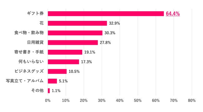 次いで「花」「食べ物・飲み物」「日用雑貨」と続きました。記念品のような形に残るものよりも、消耗品や普段使いができるものの人気が高いようです。また、「何もいらない」という人も17.3%いました。
