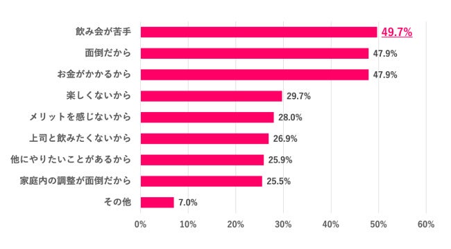 職場の歓送迎会に参加したくない理由で最も多かったのは「飲み会が苦手」で49.7%、次いで「面倒だから」「お金がかかるから」がそれぞれ47.9%という結果になりました。