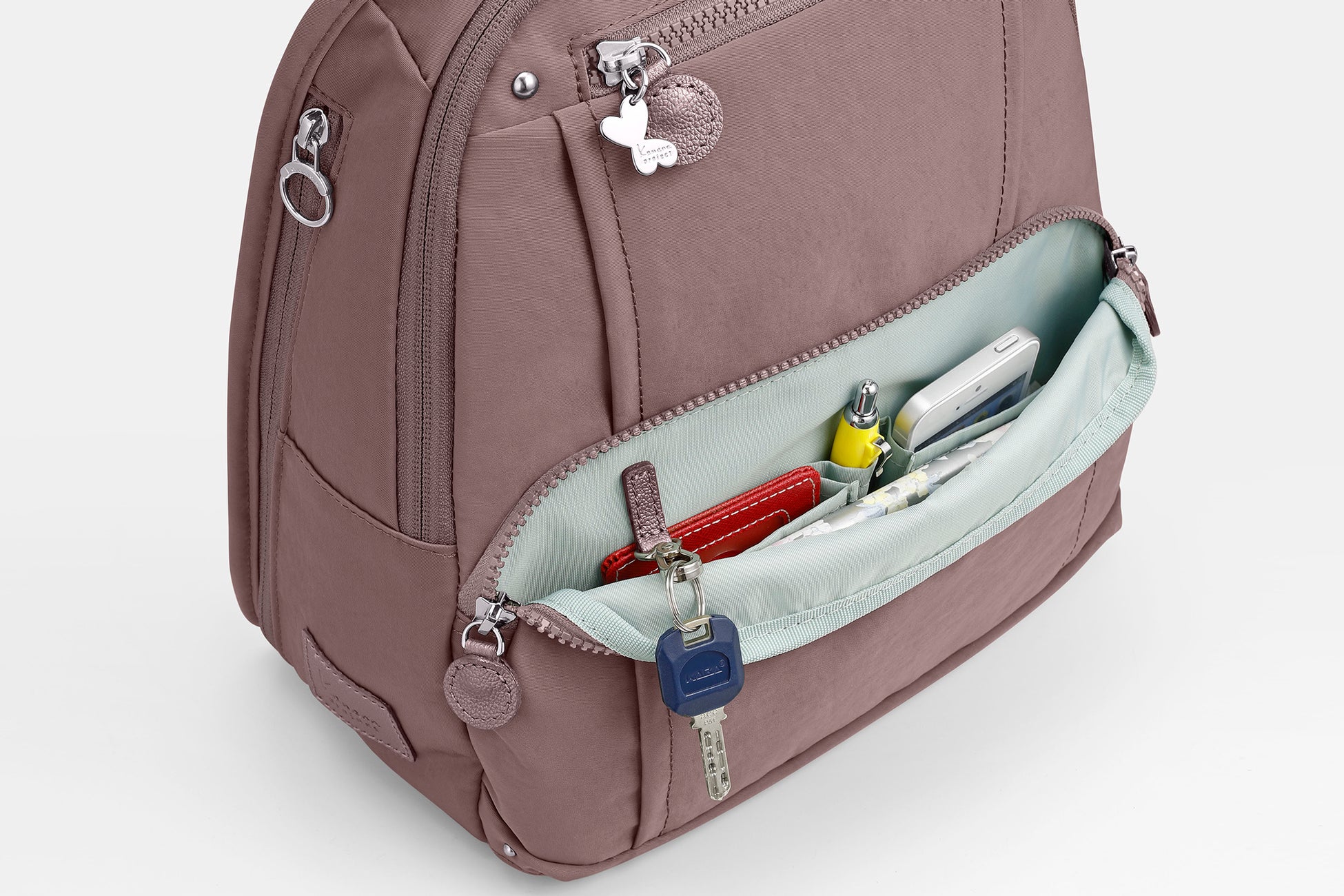 リュック上部はスリムに、下部はしっかりとマチ幅を設けることで、見た目の印象以上にたくさんの荷物を収納できます。内装に中身が見えるメッシュポケットや、折り畳み傘を差し込めるホルダーなどの多彩なポケットを配置しました。