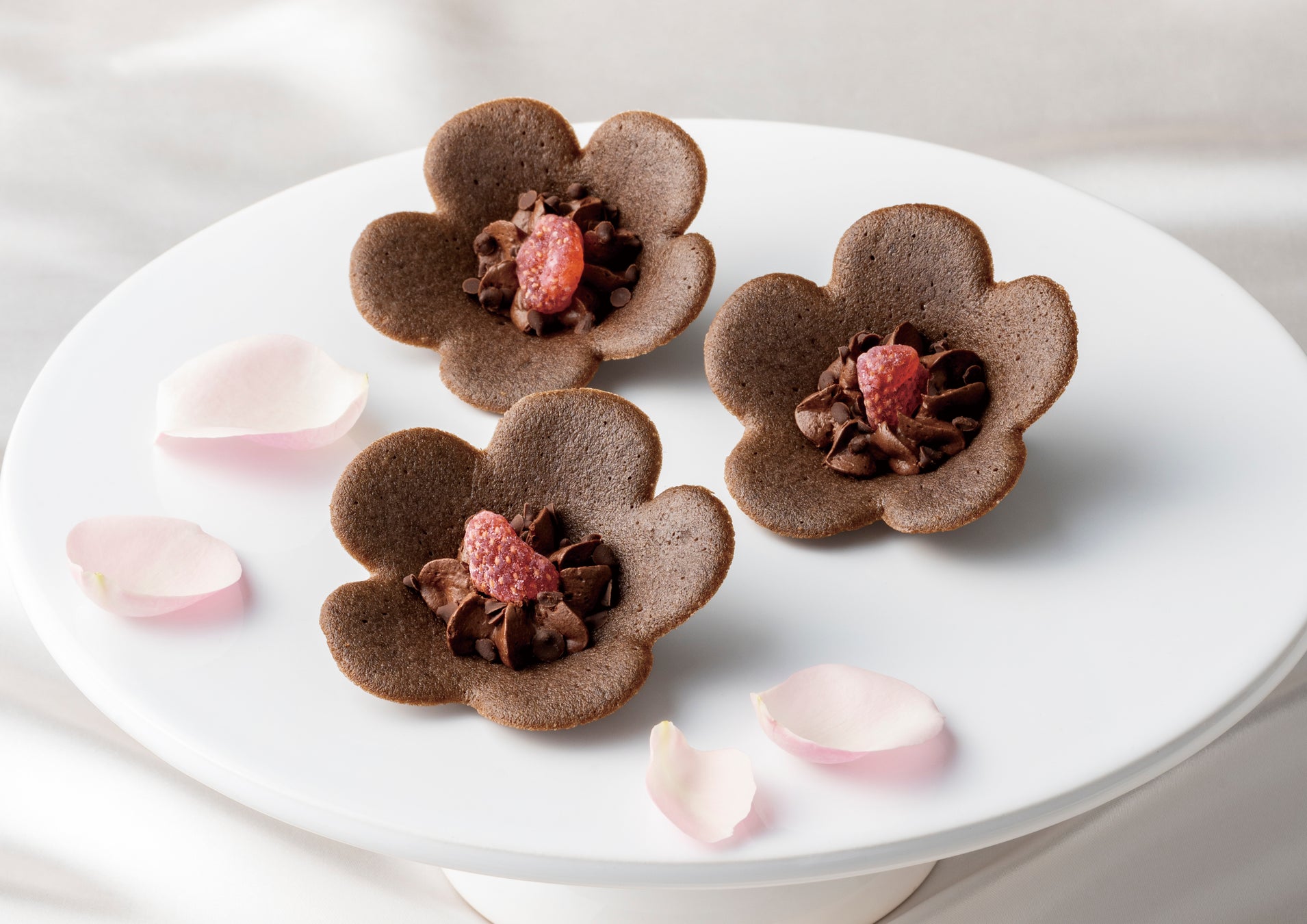 可愛らしい花形のさっくりとしたココア生地に、濃厚なチョコレートクリームを絞り、ドライストロベリーとチョコチップを載せました。発酵バターが香る風味豊かな生地とチョコレートのコク深い味わいがマッチした、贅沢な一品です。