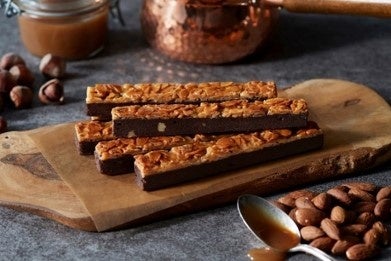 ヘーゼルナッツペーストを混ぜ込んだブラウニー生地の上に、アーモンドとカラメルのヌガーを重ねました。