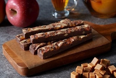 厳選した3種類のクーベルチュールチョコレートをブレンドした⽣地に、林檎とキャラメル、くるみを練り込みカルバドスでより林檎の風味を引き立てました。