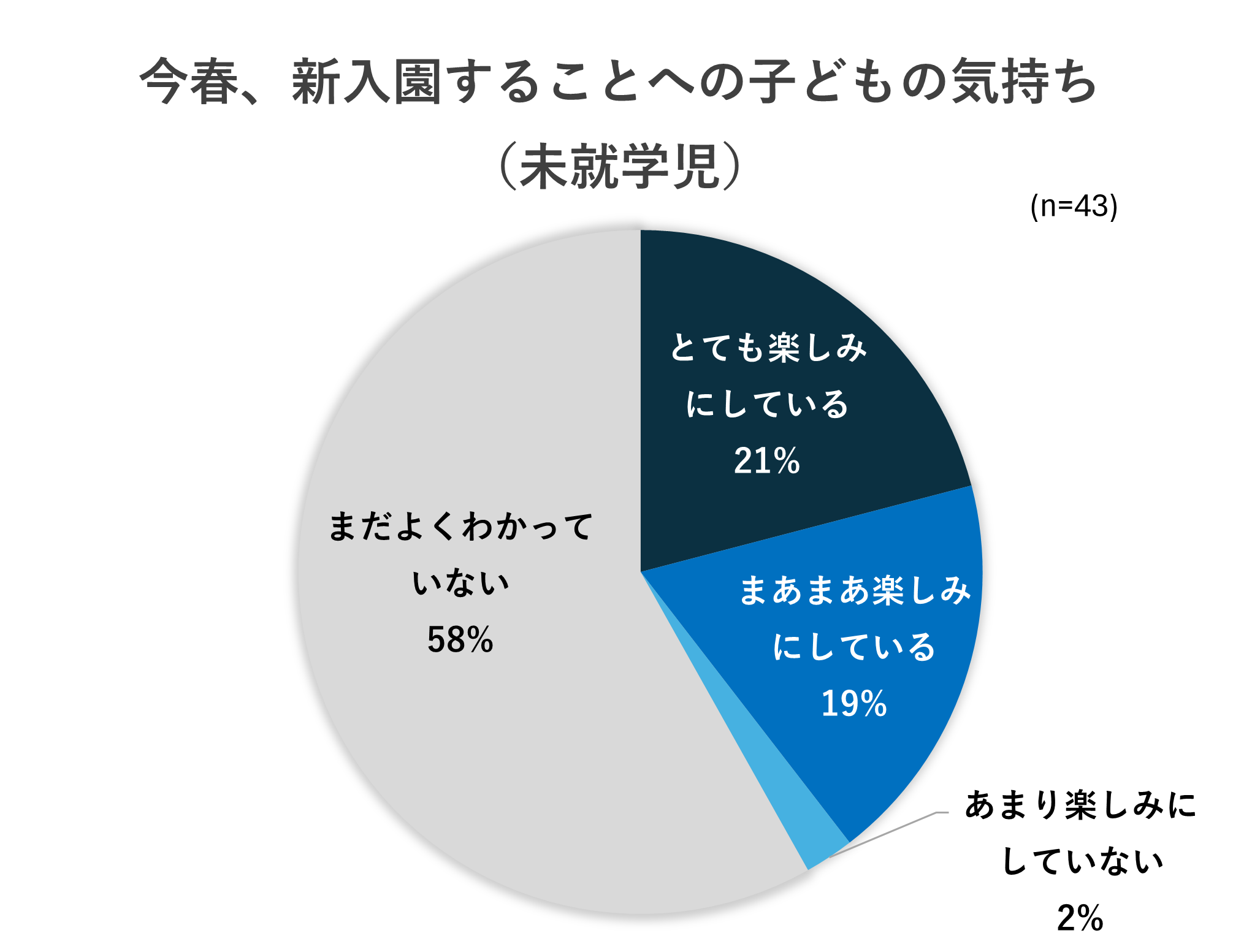 一方で、「とても楽しみにしている」と「まあまあ楽しみにしている」を合わせると、約4割のお子さんが入園に対して前向きな期待を抱いていました。