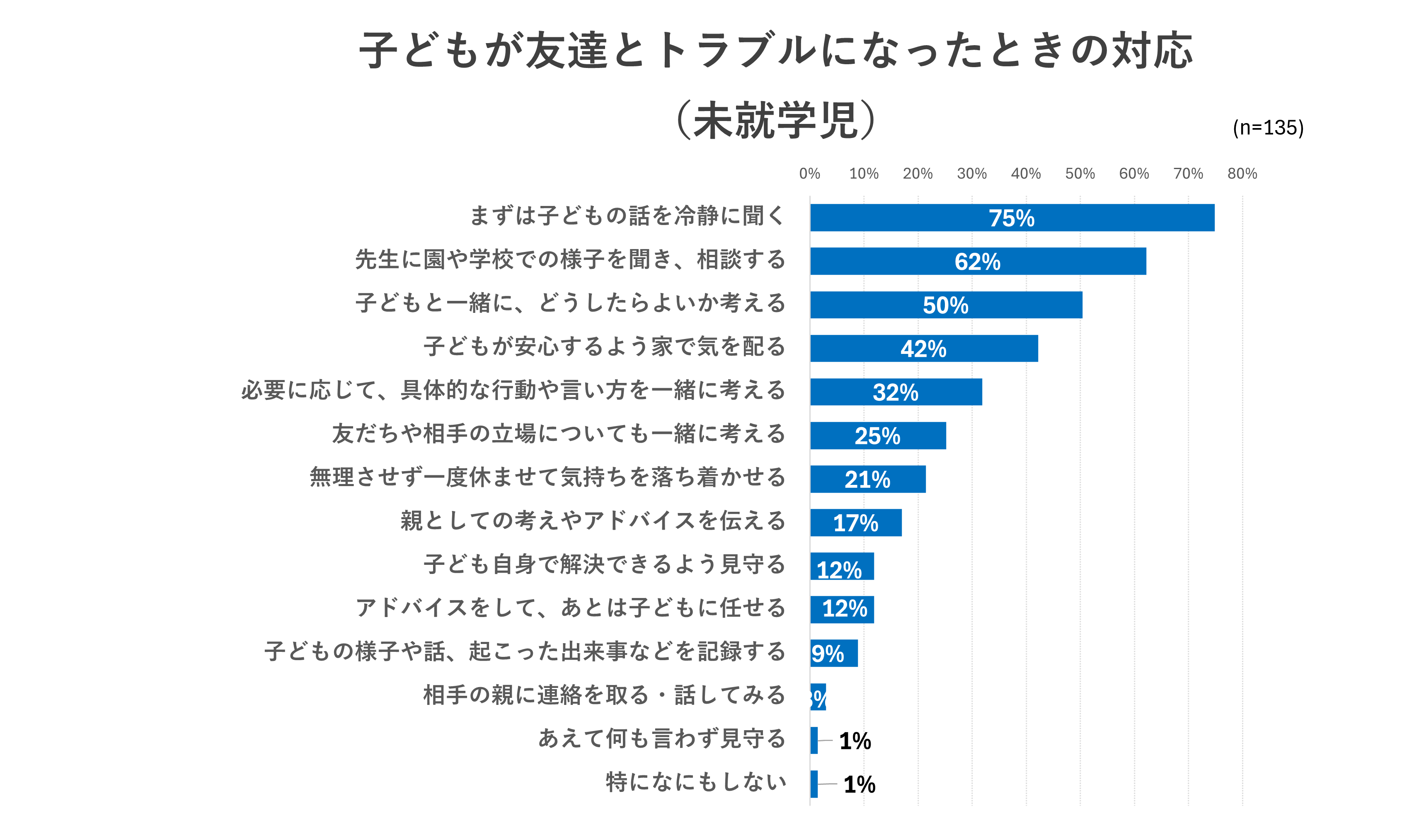 また、「子どもと一緒に、どうしたらよいか考える」(50%)と、半数の保護者が回答。子ども自身がどうすればよいかを考えることを大切にしながら、友だちとの関わり方を身につけていってほしいという保護者の想いが感じられます。さらに、「子どもが安心できるよう家で気を配る」(42%)なども多く、家庭を子どもにとって安心できる場所にすることも、重要だといえそうです。