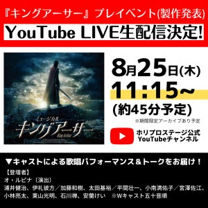 8月25日(木)に本作のプレイベント(製作発表)が開催決定。歌唱&トークで構成される本プレイベントは一般オーディエンスに向けてYouTubeLIVEでの生配信も実施、上演に向けてキングアーサーの世界を垣間見られる貴重な機会だ。