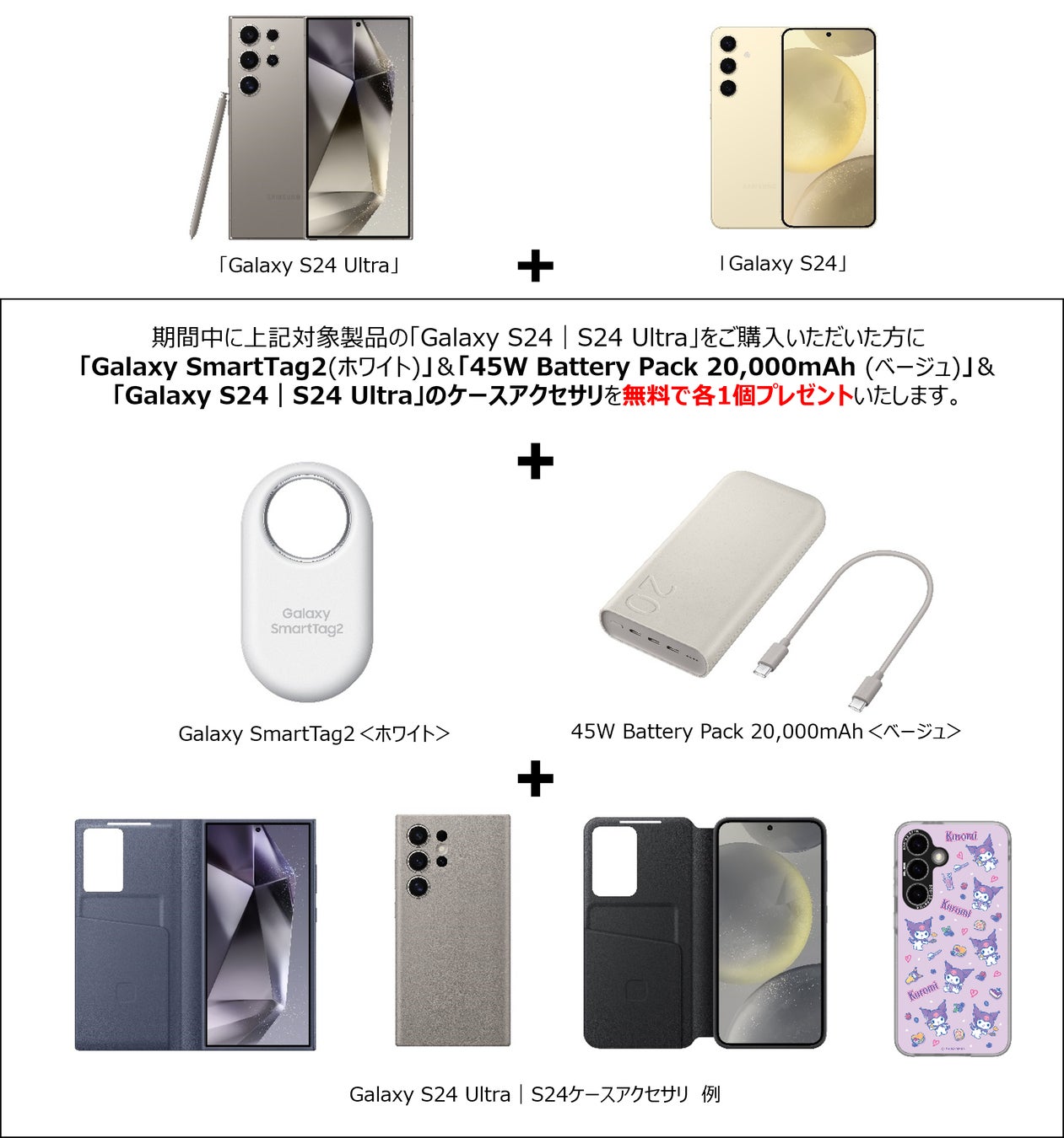 ※割引対象の「Galaxy S24 Ultra|S24」をカートに追加いただくと自動で「Galaxy SmartTag2」<ホワイト>と「45W Battery Pack 20,000mAh」が自動で追加されます。