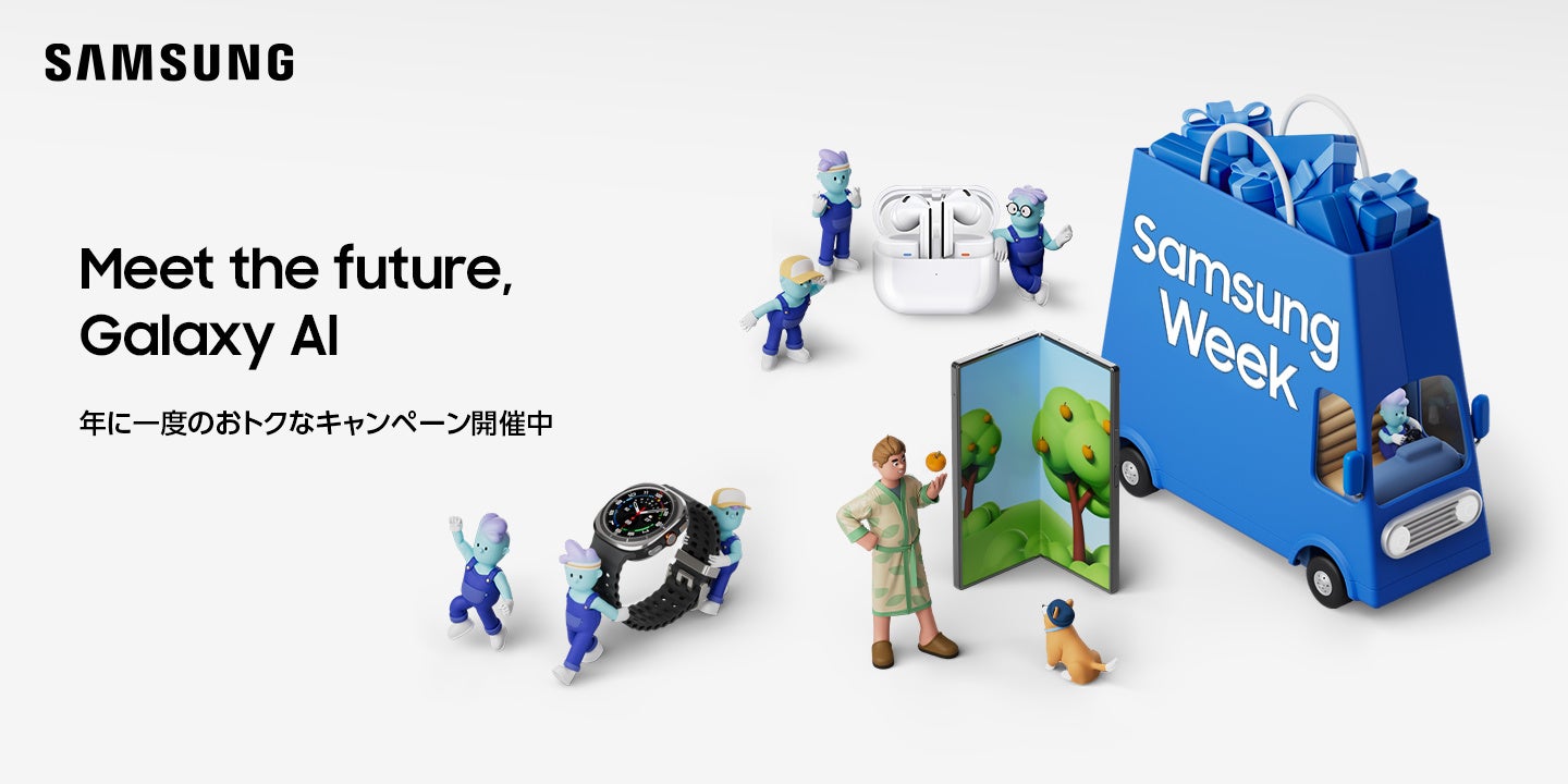 サムスン電子ジャパン株式会社は、本日2024年10月11日(金)より、当社公式サイト「Samsungオンラインショップ」(https://www.samsung.com/jp/offer/)にてGalaxy製品をおトクな価格でご購入いただける「Samsung Week」を開催いたします。期間は2024年10月11日(金)9:00~2024年10月31日(木)23:59です。
