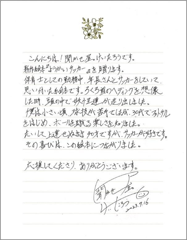 その後も、保育園の現場で読み聞かせた経験を生かして文章の修正を重ね、ついに完成した『ようかいサッカー』。絵本の刊行を記念して、作者・聞かせ屋。けいたろうさんから直筆メッセージが届きました!