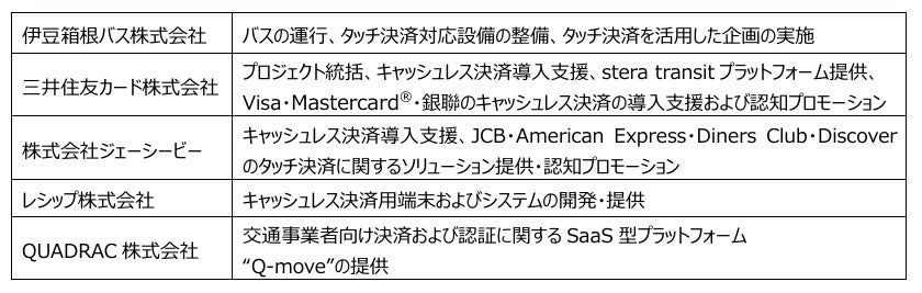伊豆箱根バス株式会社(本社:静岡県三島市、代表取締役:鬼頭 研二)、三井住友カード株式会社(本社:東京都江東区、代表取締役社長:大西 幸彦)、株式会社ジェーシービー(本社:東京都港区、代表取締役兼執行役員社長:二重 孝好)、レシップ株式会社(本社:岐阜県本巣市、代表取締役社長:杉本 眞)、QUADRAC株式会社(本社:東京都港区、代表取締役社長:高田 昌幸)は、2025年4月15日(火)に、伊豆箱根バスの一部路線で三井住友カードが提供する公共交通機関向けソリューション「stera transit」を活用した、タッチ決済対応のカード(クレジット、デビット、プリペイド)や、カードが設定されたスマートフォン等によるバス乗車サービスを開始します。