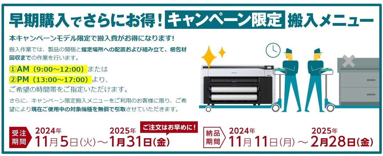 本キャンペーンでは、2025年1月31日まで(注2)にご注文いただき、2025年2月28日までに納品いただけるお客様を対象に搬入費がお得になるキャンペーン限定搬入メニューをご用意しています。また、キャンペーン限定搬入メニューをご利用のお客様に限り、ご希望により現在ご使用中の対象機種の無償引き取りサービスもご用意しています。