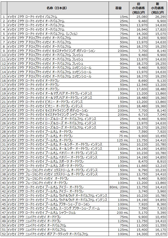 〈イッセイ ミヤケ パルファム〉は、香水原料及び包装材料の高騰により、一部商品の価格を2024年2月1日(木)より改定させていただきます。今後も大切なお客さまに、より一層ご満足いただける商品をご提供できるように努めてまいります。何卒ご理解いただくとともに、今後ともご愛顧を賜りますようお願い申し上げます。