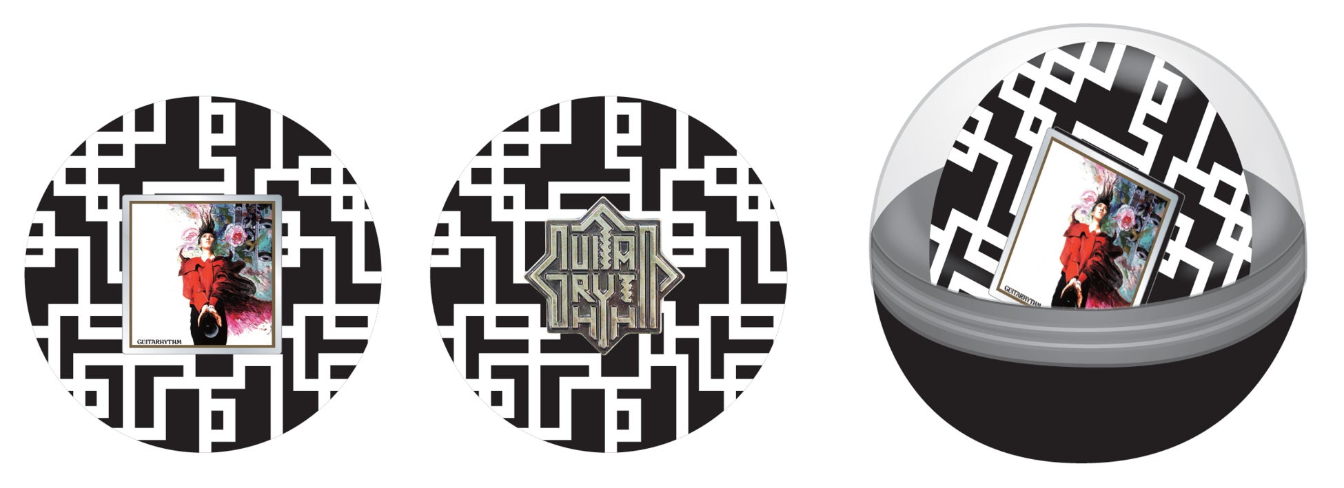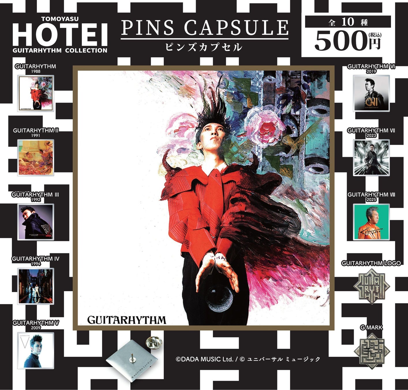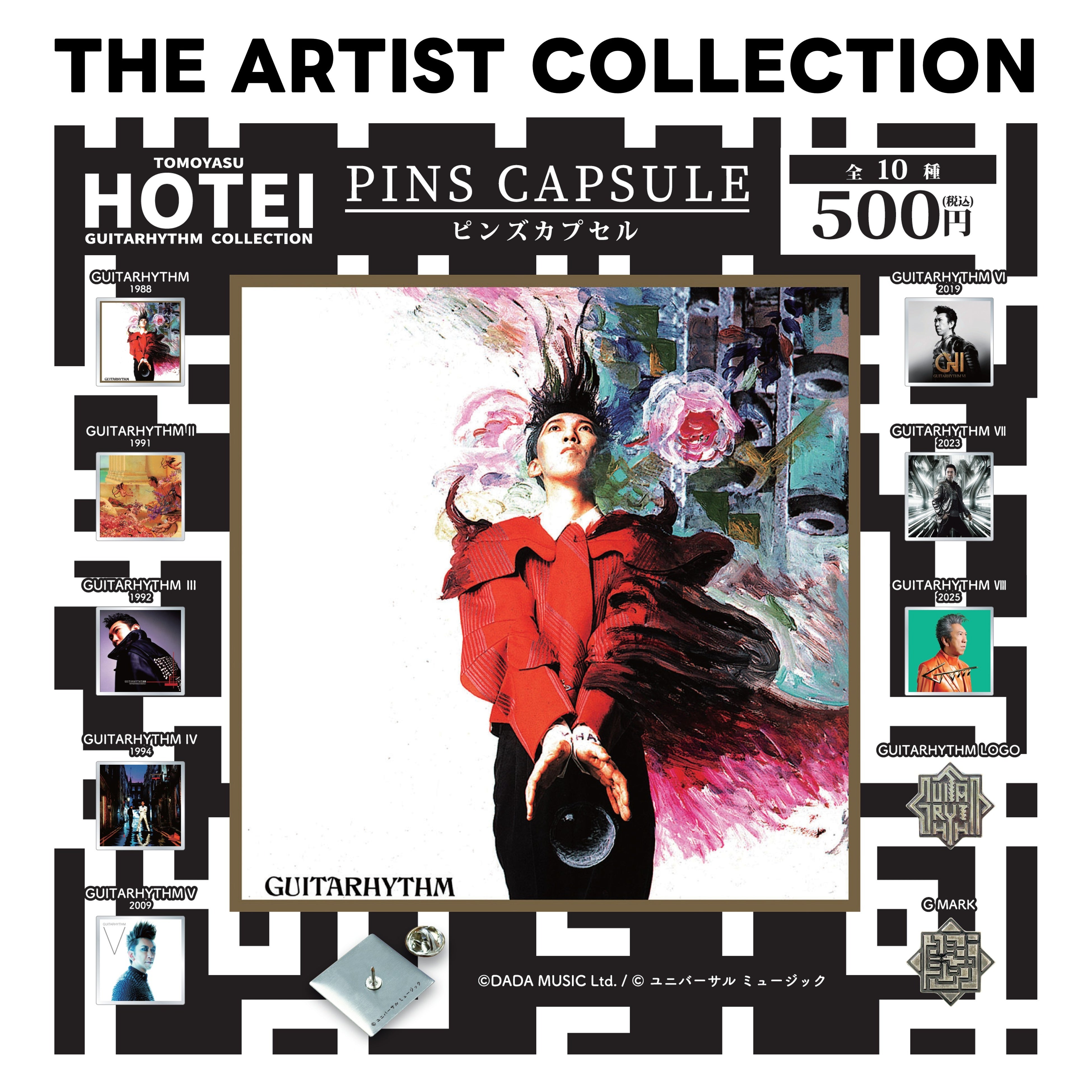 今回発売するカプセルトイは、過去にリリースしたアルバムの中から”GUITARHYTHM(ギタリズム)”をテーマに選定した8枚のアルバムジャケットのほか、”古美(ふるび)仕上げ”(※)を施したGUITARHYTHM LOGO・G MARKの2種をデザインしたピンバッジ(ピンズ)が専用台紙と共にカプセル内に収納された、プレミアムなアイテムとなっています。