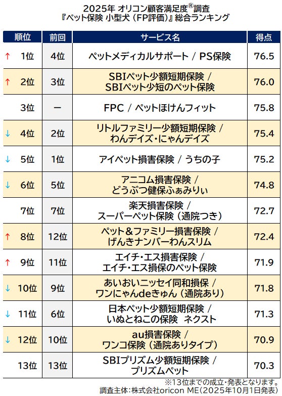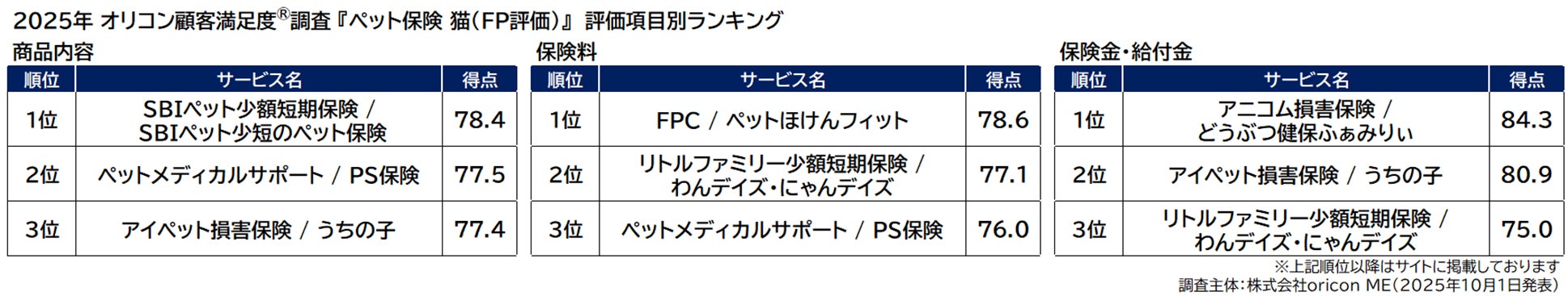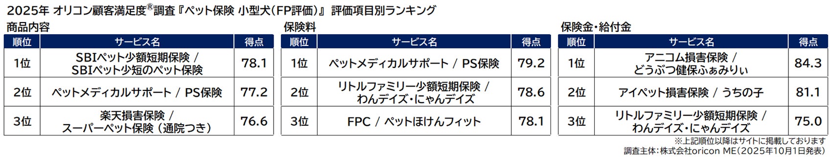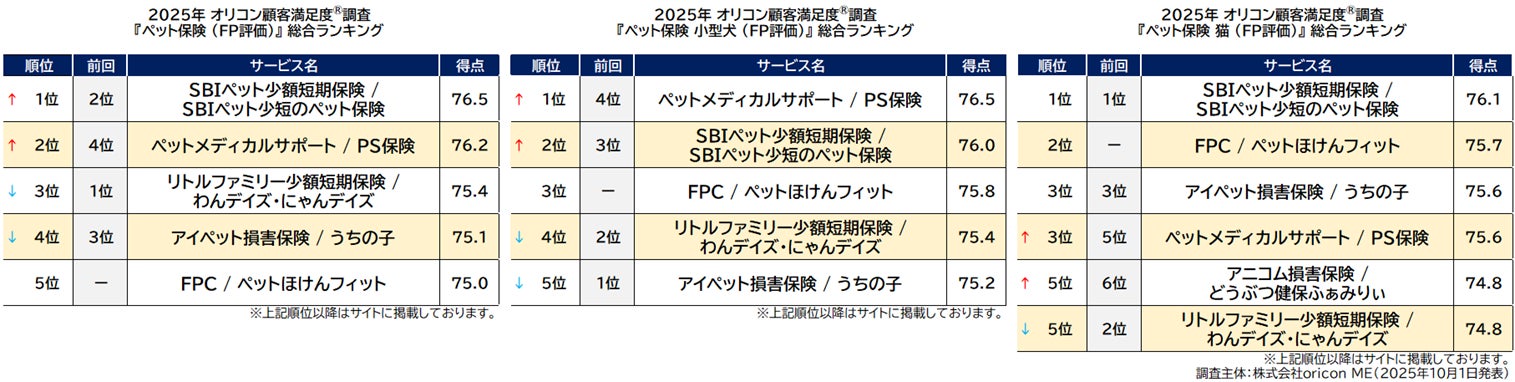 2025年10月発表 オリコン顧客満足度®調査 ペット保険(FP評価)/ペット保険 小型犬(FP評価)/ペット保険 猫(FP評価)