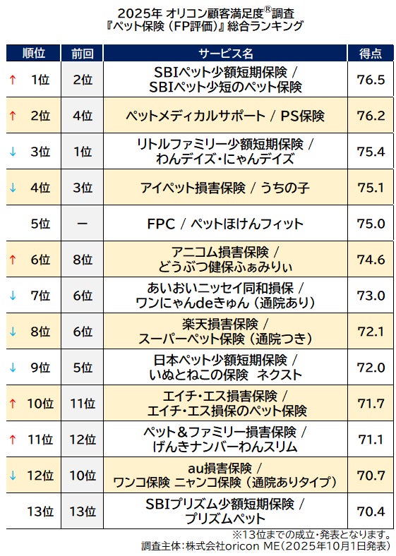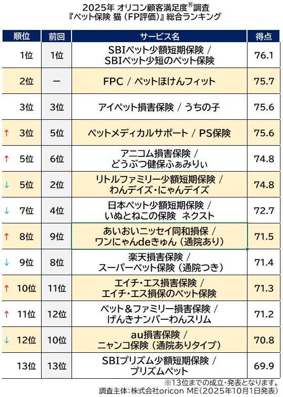 オリコン株式会社(本社︓東京都港区 代表取締役社⻑︓⼩池 恒、略称︓オリコン)は、グループ会社である株式会社oricon MEが、FP(ファイナンシャルプランナー)に聴取した『ペット保険』『ペット保険 ⼩型犬』『ペット保険 猫』ランキングの結果を、2025年10月1日(水)14時に発表いたしました。結果は、下記の通りとなりました。