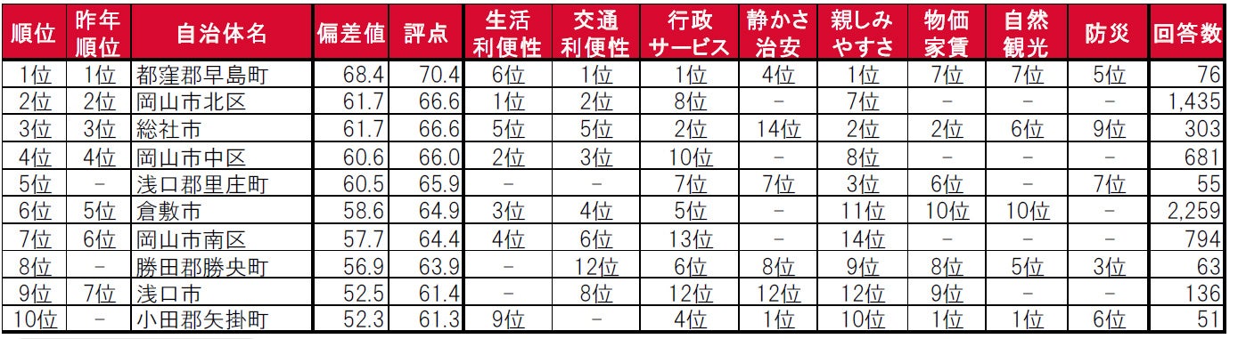 - 街の住みここちランキング2022<岡山県版>自治体TOP10 因子別順位