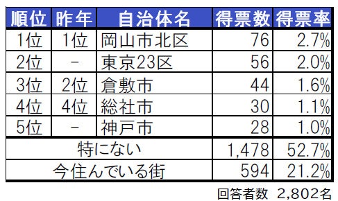 •住みたい街ランキングでは行政区をまとめて一つの自治体として集計していますが、岡山市は昨年と同様に行政区を分けて集計しています。