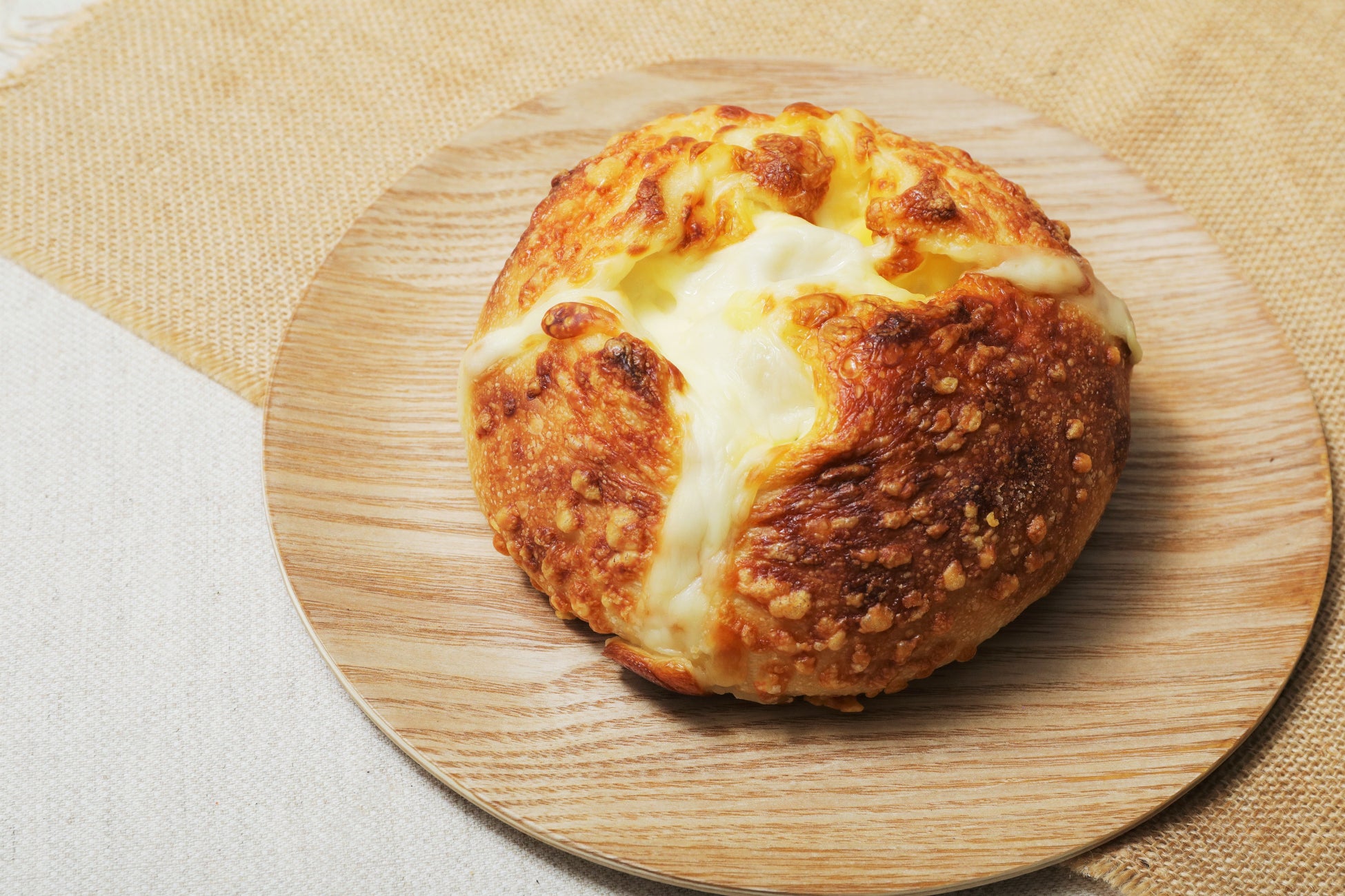 フランスパンの生地に、ゴーダチーズ、モッツァレラチーズなどのチーズを入れて焼き上げました。焼き上げるときに、十字に切った生地からチーズがあふれだします。焼き立てでいただきたい一品です。