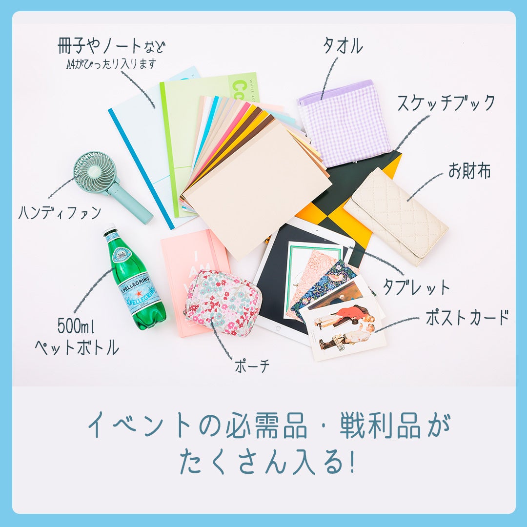 毎回好評いただいている付録は、即売会やライブなどの“推し活”にぴったりなイベントトートバッグをご用意いたしました。イベントでの戦利品や推しグッズを入れるのに重宝する大容量サイズに加え、“あると嬉しい”様々なこだわりが盛りだくさん。小さく折り畳むことも出来、サブバックとしても持ち運びが可能。カラーは、どんなコーディネートにも馴染むブルーグレーで、イベント参戦時はもちろん、普段使いにも合わせやすい可愛いアイテムです。フロントのDカンに、パスケースやぬいぐるみ、アクリルキーホルダーなどを付けて自分だけのアレンジもぜひお楽しみくだい。