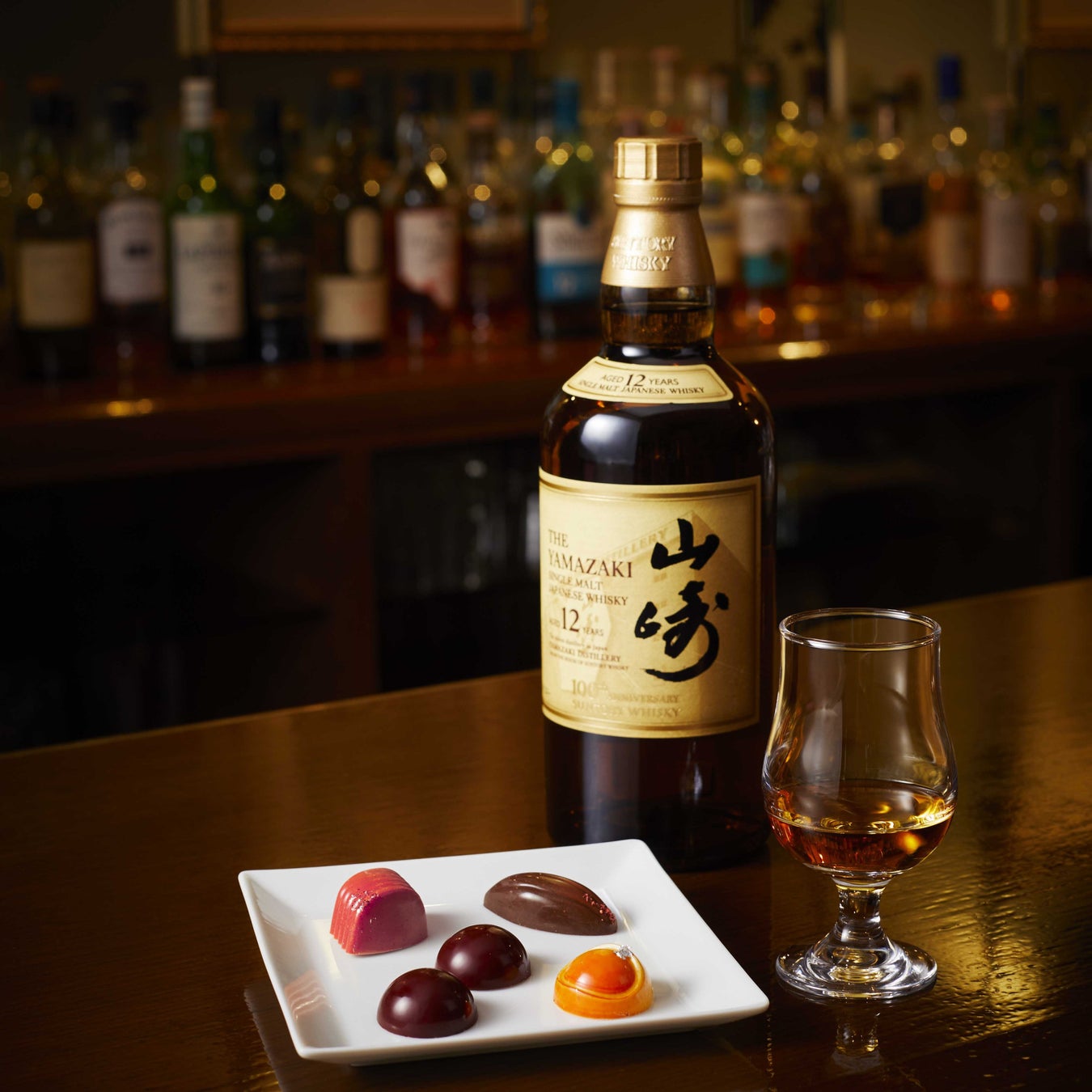 上質なホテルのメインバーで嗜む「山崎12年」は、その繊細で複雑な香り、深い味わいを存分にご堪能いただけるよう、おすすめはストレートで、ボンボンショコラを合わせてご用意いたします。芳醇な香りを感じていただけるようショコラの薄さを追求し、口あたりなめらかに仕上げたボンボンショコラと合わせて、ゆったりとしたひとときをお過ごしください。