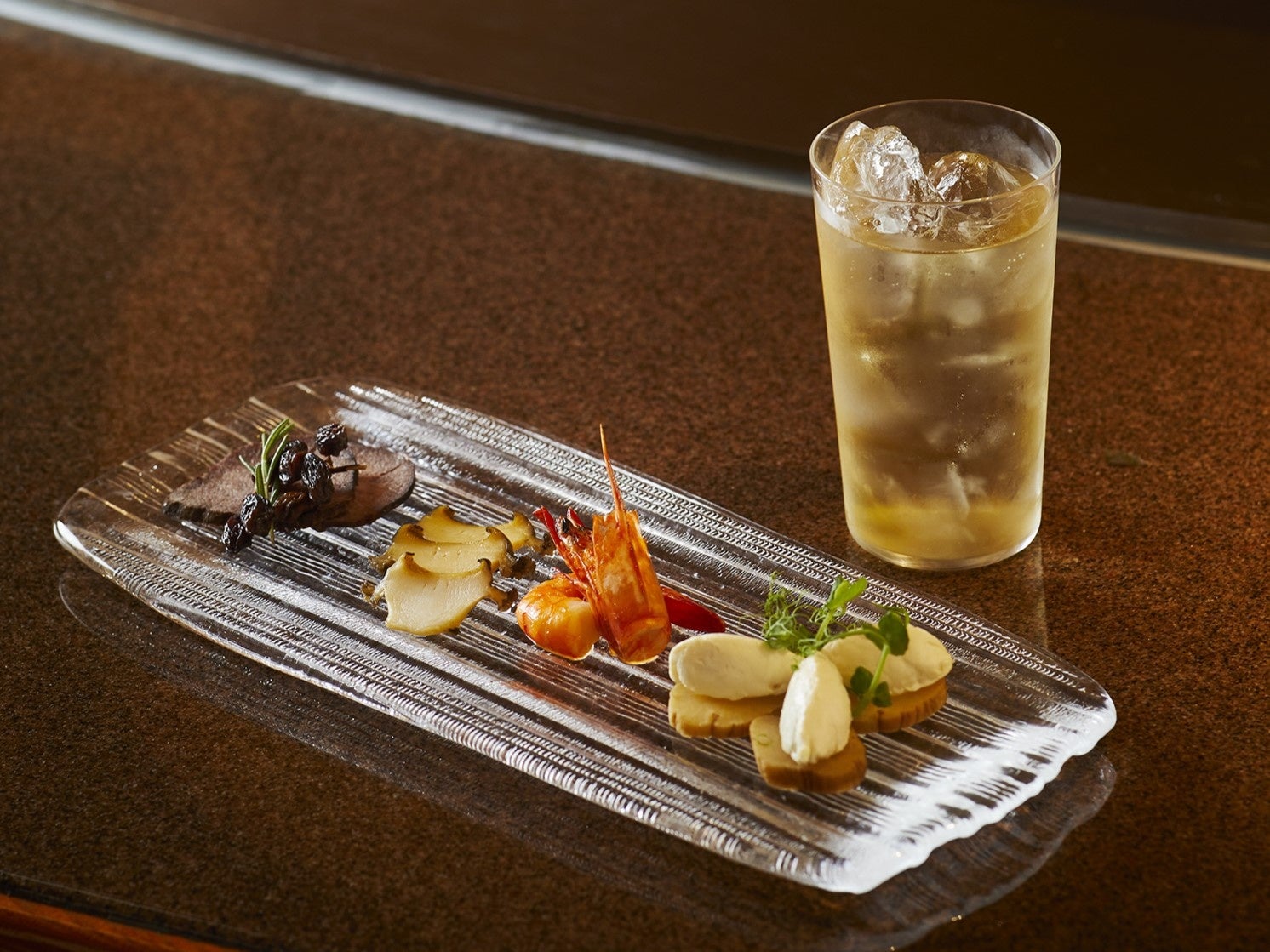 「山崎12年」に合わせて、牛タン、鮑、海老、いぶりがっこを燻製にしてご提供いたします。燻製独特の風味と、燻製によって旨みを引き出した食材は「山崎12年」とベストマッチ。食前やお食事中にお楽しみいただけるよう、ハイボールをおすすめのペアリングといたしました。