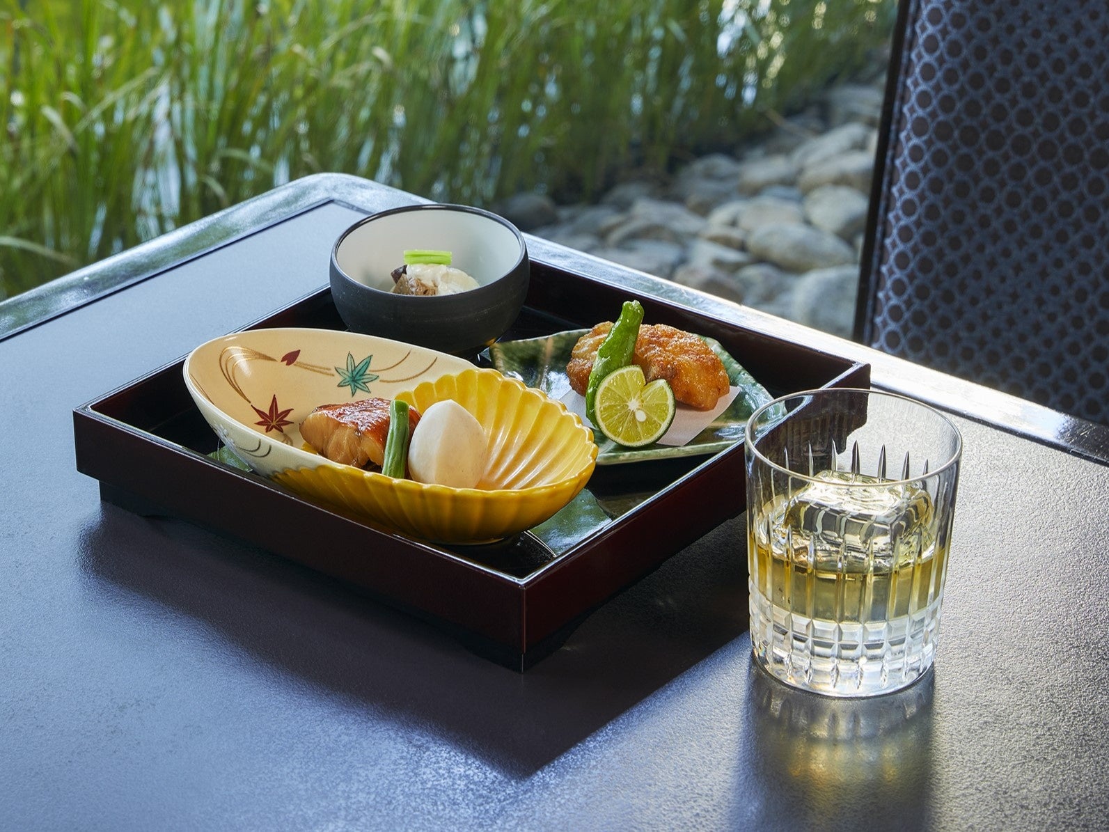 日本料理の繊細な味わいと「山崎12年」の味わいが調和するよう、ハーフロックまたはトワイスアップでの飲み方をご提案いたします。マリアージュメニューには、桜のチップで豆腐を燻し、器を開けると煙が出る仕掛けもお楽しみいただける、燻し豆腐白和えをはじめ、ウイスキーの香りでアレンジしたふぐの唐揚げ、甘辛の味わいがウイスキーを引き立てる金目鯛の旨煮をご用意いたしました。