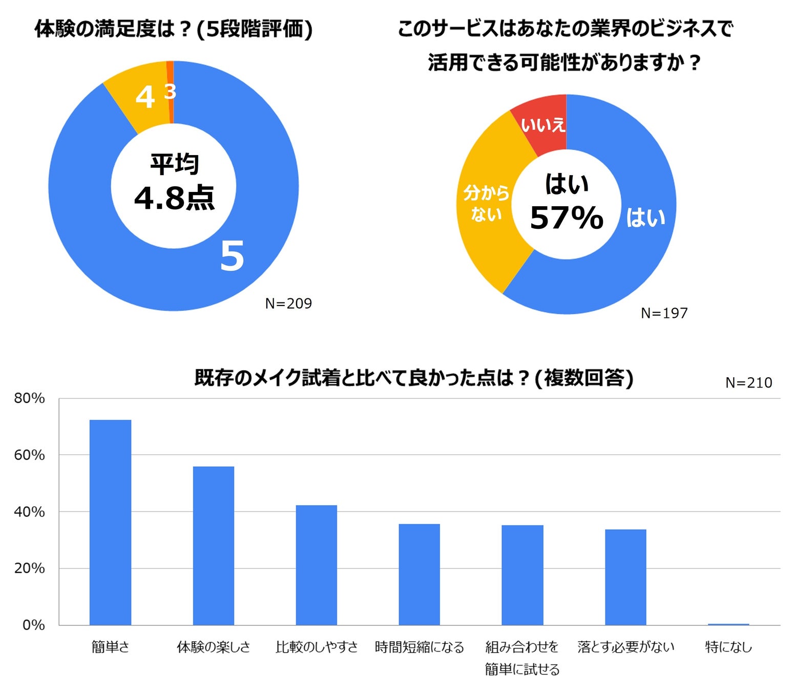 当社のブースには少なくとも1,400名以上が来場し、多くの方に実際のサービスを体験してもらいました。体験後のアンケートでは、満足度は5段階評価で平均4.8点と非常に好評であり、実際のメイク試着と比べた利点として、簡単さ、楽しさ、比較のしやすさなどが挙げられました。「メイクが得意ではないので嬉しい」「みんなの役に立つ」といった意見も寄せられたほか、普段は選ばないグリーンのアイメイクをまとって笑顔で帰る体験者など、新しい自分の発見を感じさせる様子も見受けられました。また、自身の業界のビジネスへの活用についても、回答者の57%が「可能性がある」と回答しており、国内や美容業界に留まらず、応用の可能性があることが示唆されました。