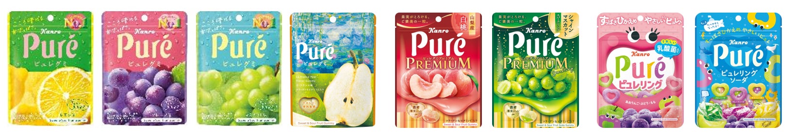 『ピュレグミ』は、2002年の発売以来、幅広い世代の方からご支持いただいているカンロの人気商品です。フルーツのおいしさを引き出す“すっぱいパウダー”と独自の“果肉食感”により、噛むほどにフルーティーな甘ずっぱいおいしさが広がり、食べた瞬間こころが晴れるように、ちょっとハート(気持ち)があがるハート型のグミです。