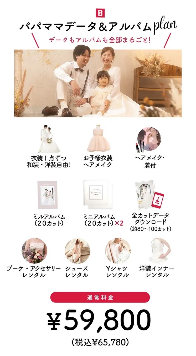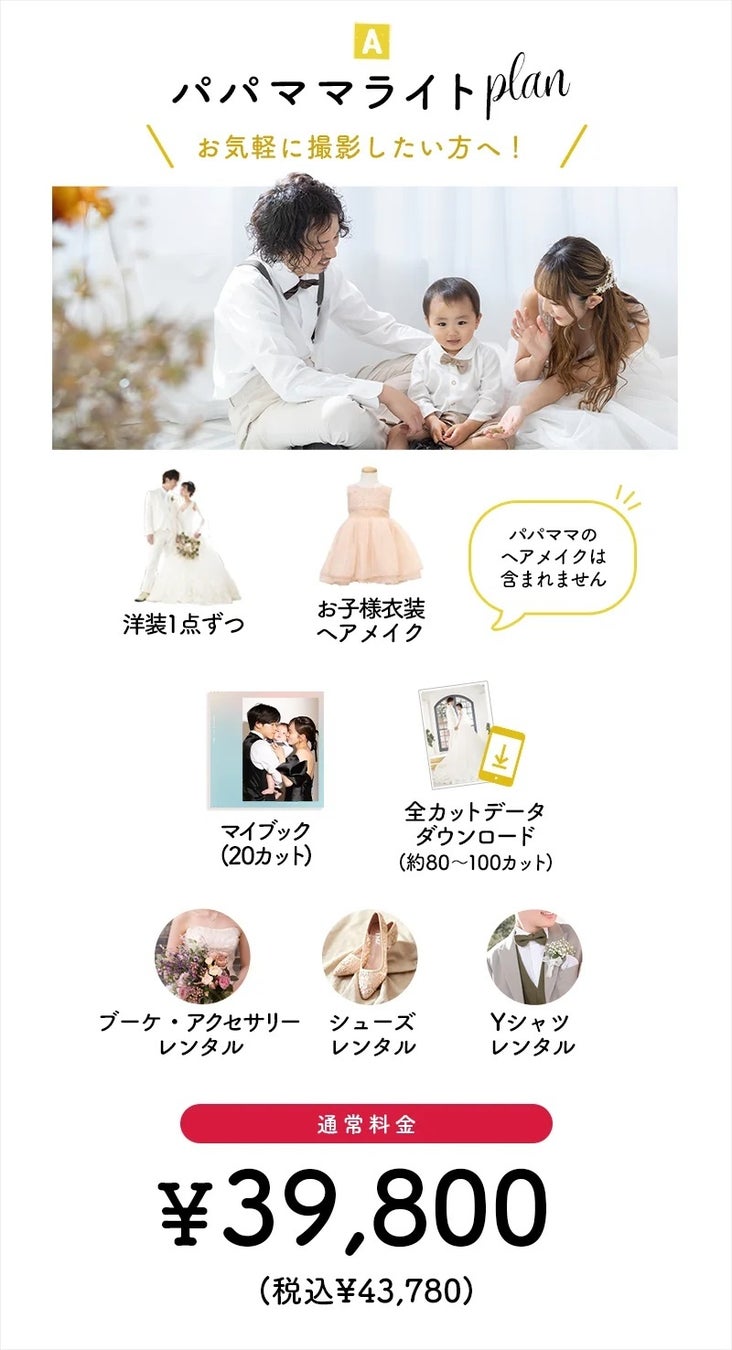 いずれも、パパママ&お子様の衣装がセットに入っているので、このセット価格でみんなで撮影を楽しんでいただけるプランになっています。