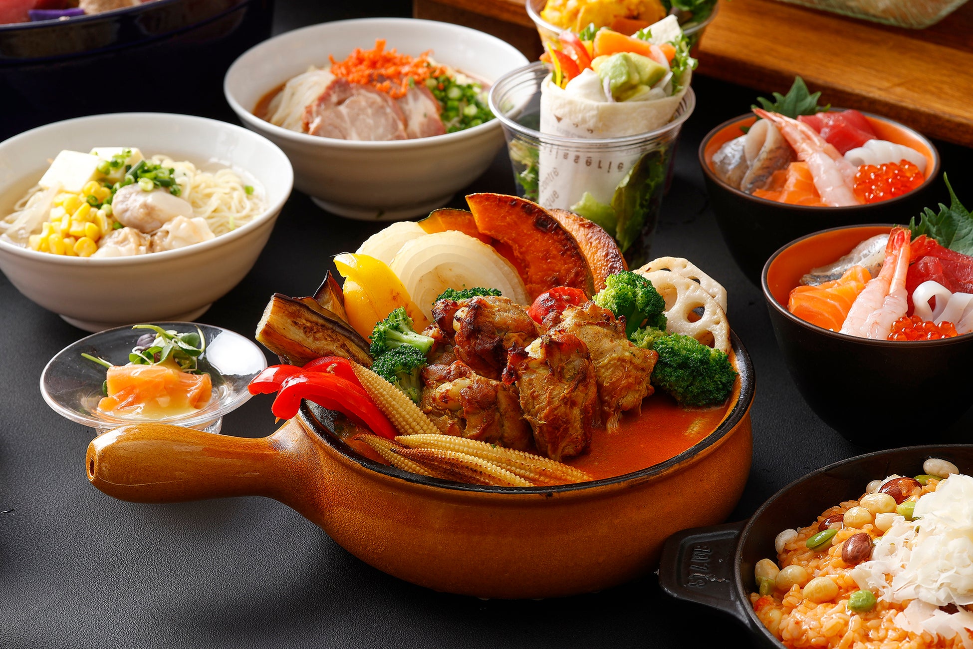 温製料理には、北海道産のタラバ蟹や帆立などの魚介の旨みがたっぷりと詰まったブイヤベース、北海道産ホワイトコーンのクリームグラタン、秋の味覚である芳醇な香りと濃厚な旨みが魅力の十勝マッシュとミートパテをのせた北海道産仔牛、北海道産カラフルビーンズを使用した濃厚な味わいの雲丹リゾット、音更町にある竹内養鶏場のお米で育った白い卵「米艶(こめつや)」をだし巻き風のオムレツにアレンジし蟹餡をのせたシンプルで上品な味わいの一品、芽室町の熟成ジャガイモとたっぷりの野菜、チキンを自由にカスタマイズしていただける札幌名物スープカレーなどを提供いたします。