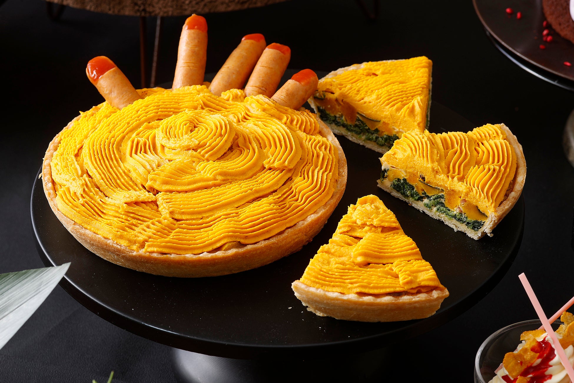 さらにハロウィンにちなみ、フィンガーをモチーフにしたチョリソーを添えたシェフのユーモアあふれるカボチャのキッシュが登場。