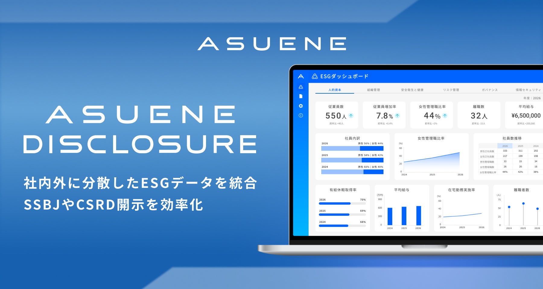 アスエネ株式会社(本社:東京都港区、Founder 代表取締役CEO:西和田浩平)は、CO2排出量の見える化・削減・報告クラウド「ASUENE」に、独立型のESGレポート機能「ASUENE DISCLOSURE(アスエネ ディスクロージャー)」を追加しました。これまで算定機能と一体で提供していたESGデータ管理やESGレポート機能を、単独で利用できるようになります。