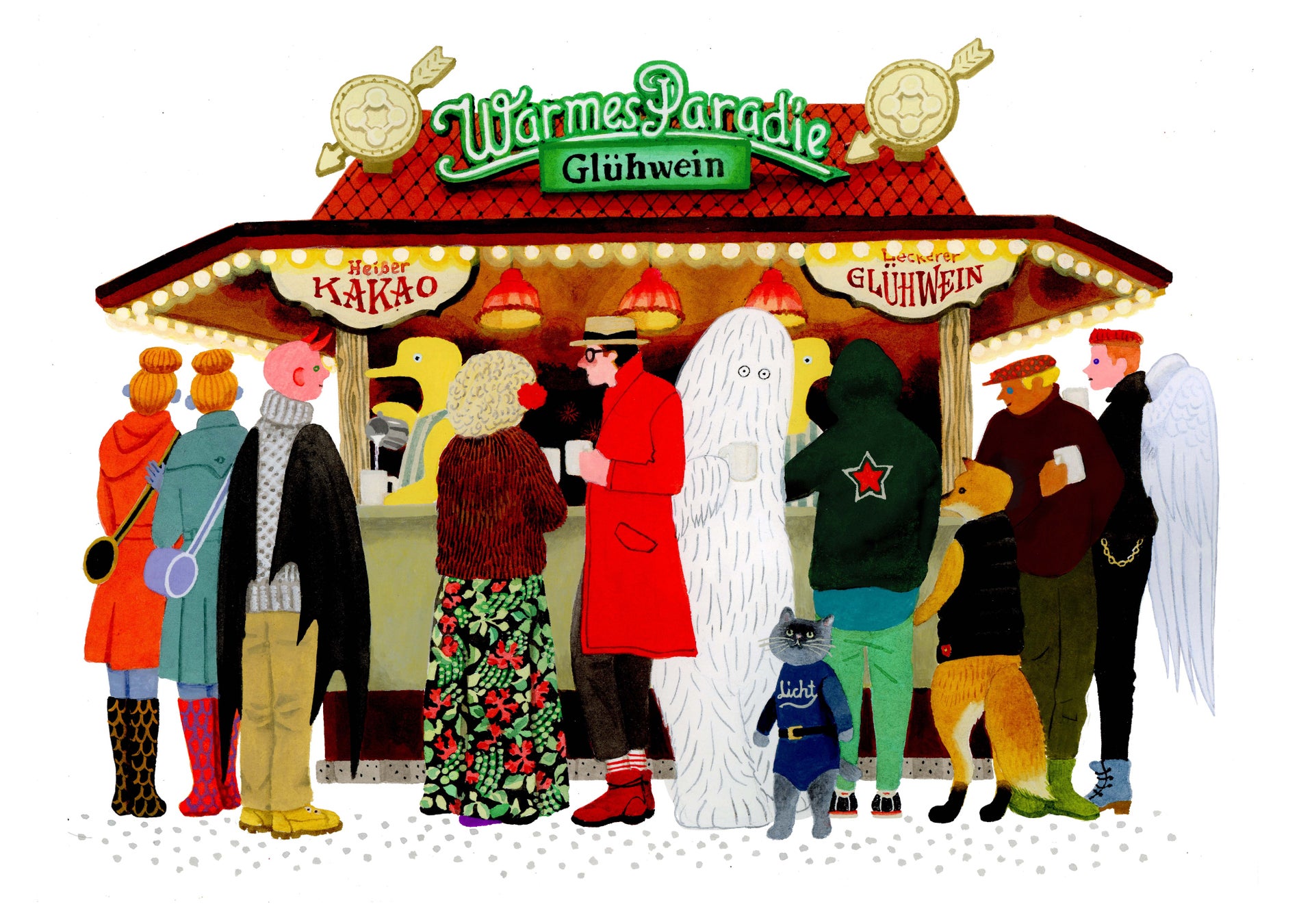 武蔵野美術大学日本画科を卒業後、フリーのイラストレーターとして、広告、書籍、絵本などさまざまな媒体で活動しています。伝説の生物「イエティ」を描いたシリーズが人気です。本フェアに向けて新たに描き下ろした、ホリデーシーズンを気ままに楽しむイエティたちの原画作品が登場します。ヨーロッパのクリスマスマーケットでホットワインを楽しむ姿や、サーカスの出店で一息つく姿、栗が買えてご満悦な姿をやわらかいタッチでユーモラスに描きます。
